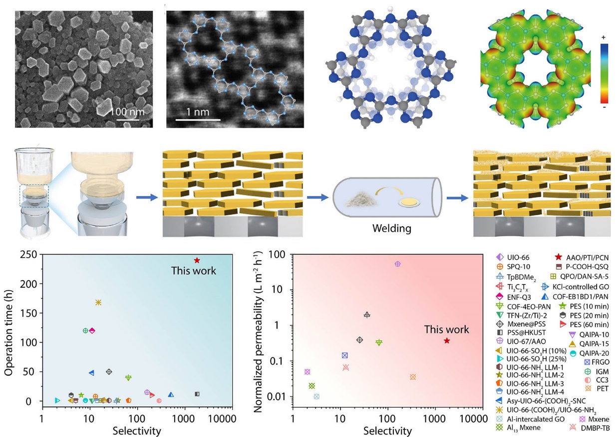 研究團(tuán)隊(duì)制備了具有埃級(jí)孔的結(jié)晶型氮化碳(聚三嗪酰亞胺),經(jīng)超聲剝離、真空抽濾得到結(jié)晶氮化碳納米片膜,進(jìn)一步利用“congener welding”策略在其表面沉積無(wú)定形氮化碳,得到界面接觸緊密且相容性高的晶體/聚合物復(fù)合膜。得益于聚三嗪酰亞胺均勻、窄的孔隙以及孔道內(nèi)豐富的離子結(jié)合位點(diǎn),復(fù)合膜在鋰鎂分離中表現(xiàn)出色,可從高濃度Mg2+(1.0 M)中篩出極低濃度的Li+(0.002 M),選擇比達(dá)1708。該工作為設(shè)計(jì)新型鋰鎂分離膜提供了新思路,為實(shí)現(xiàn)從高鎂鋰比鹽湖高效穩(wěn)定提鋰提出了可行方案。