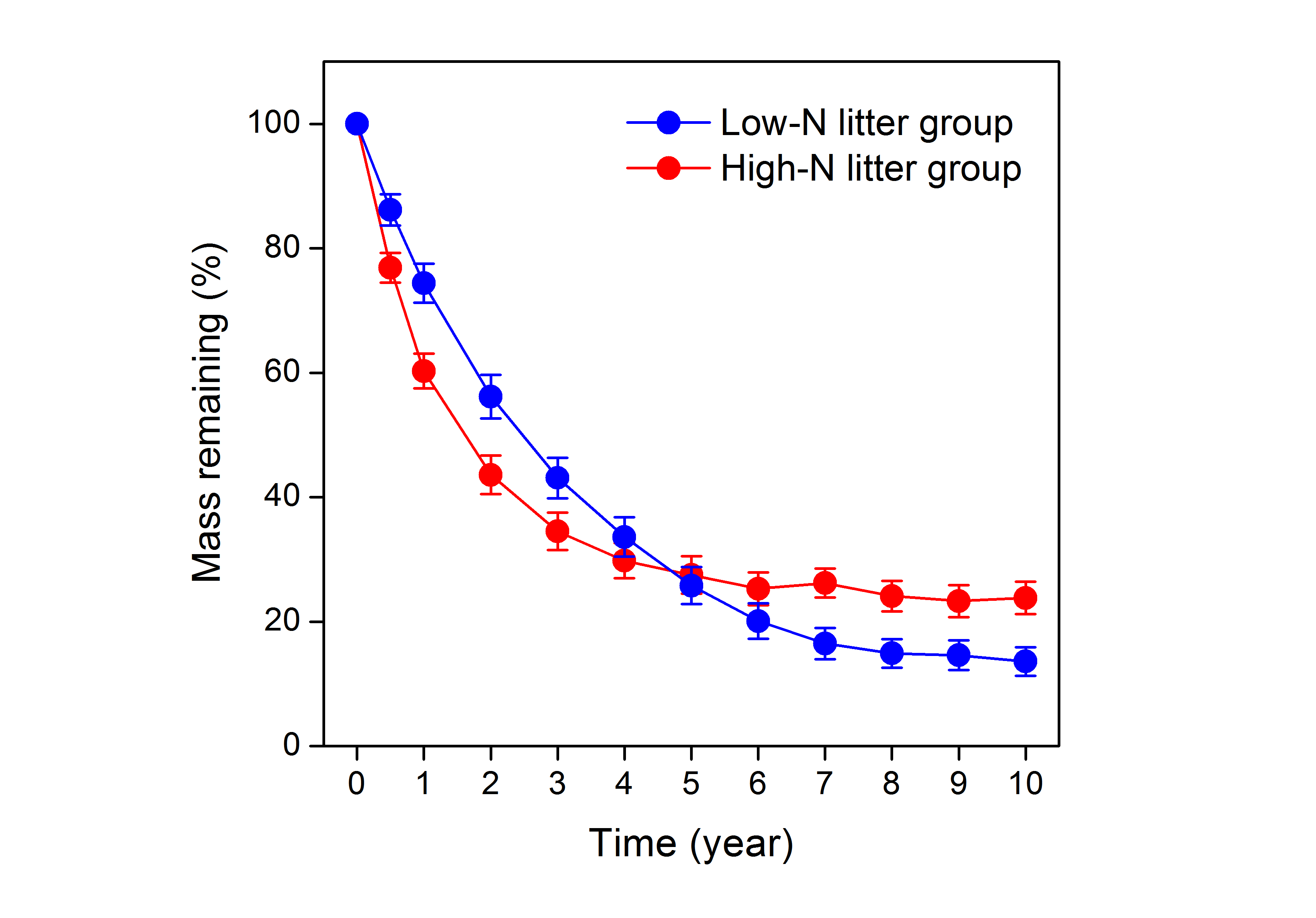 凋落物分解是森林碳循環(huán)和全球碳平衡的一個關(guān)鍵環(huán)節(jié),其分解特性影響著森林生態(tài)系統(tǒng)的能量流動和物質(zhì)循環(huán)。另外,凋落物分解也是維持森林生產(chǎn)力與土壤肥力的關(guān)鍵驅(qū)動機(jī)制。大量研究表明,氮元素是調(diào)控森林凋落物分解速率的關(guān)鍵因素,凋落物氮含量與分解速率的正相關(guān)關(guān)系已被廣泛應(yīng)用于生物地球化學(xué)循環(huán)和生態(tài)系統(tǒng)模型。該結(jié)論(氮與分解速率呈正相關(guān)關(guān)系)主要是基于短期的凋落物分解研究,其分解周期通常小于3年。然而,凋落物分解是一個持續(xù)數(shù)年至數(shù)十年的緩慢過程,尤其在分解速率較為緩慢的溫帶森林和北方森林。目前,氮元素對長期凋落物分解速率的調(diào)控如何,氮含量與分解速率的正相關(guān)關(guān)系在分解后期是否可以維持?研究結(jié)果是否具有普適性規(guī)律?這些問題均未解決,因而限制了森林生態(tài)系統(tǒng)凋落物管理。