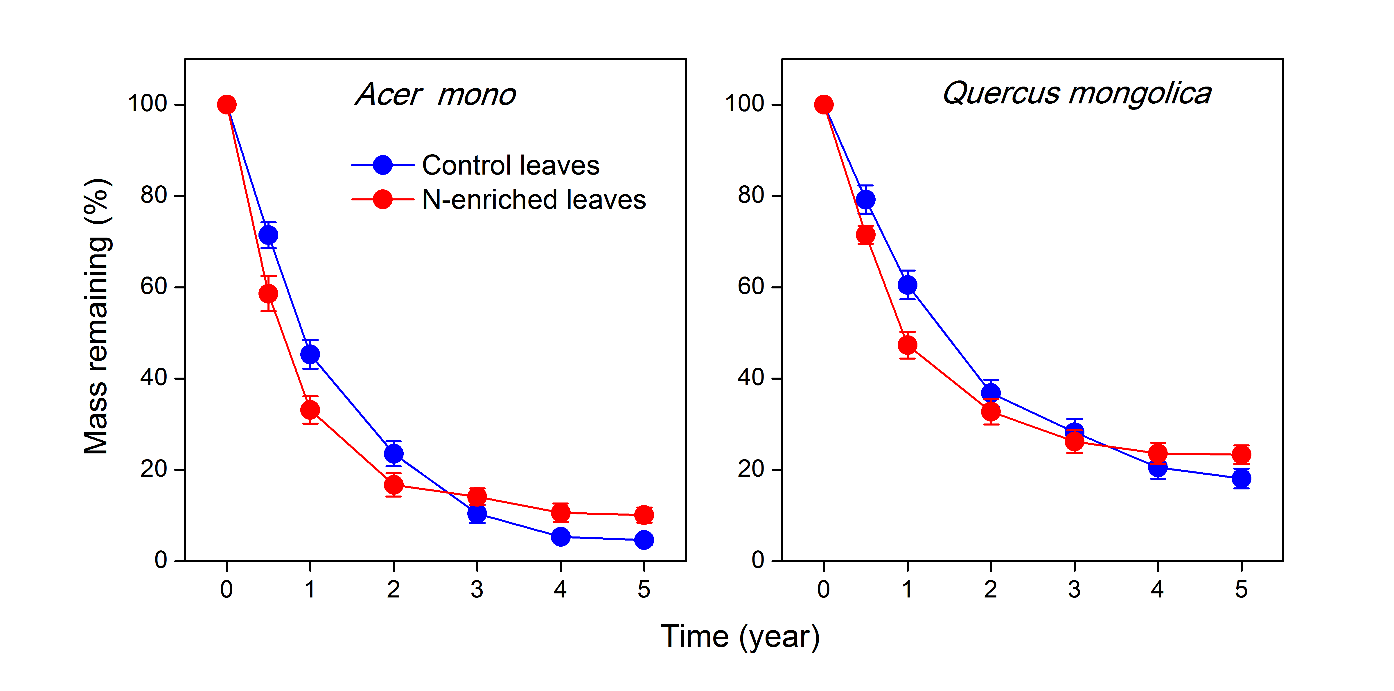 圖2 氮肥處理對五角槭和蒙古櫟凋落物分解過程中殘留率的影響