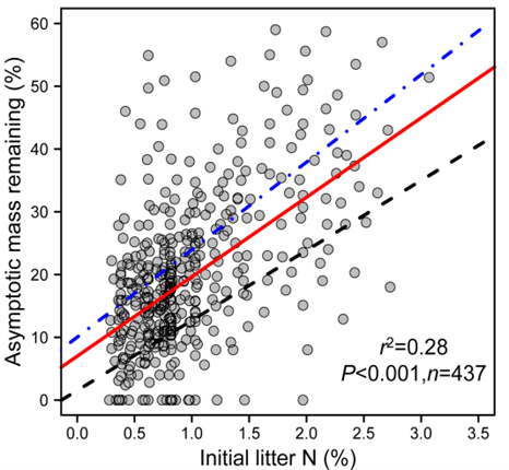 為進(jìn)一步驗(yàn)證氮元素與長期凋落物分解速率存在的這一“反轉(zhuǎn)”現(xiàn)象,研究團(tuán)隊(duì)通過對凋落物基質(zhì)含量差異較大的2個不同樹種(五角槭和蒙古櫟)葉片添加氮肥的手段,得到了氮含量不同的凋落物樣品,并放置到野外進(jìn)行長期凋落物分解。研究結(jié)果發(fā)現(xiàn),即使對同一樹種,氮含量較高的凋落物初期分解較快而后期分解速率較慢,也就是氮濃度與分解速率的正相關(guān)關(guān)系也會隨時間而發(fā)生“反轉(zhuǎn)”。同時,為了揭示氮元素與長期凋落物分解速率存在的這一“反轉(zhuǎn)”現(xiàn)象是否在溫帶森林和北方森林具有普適性規(guī)律,通過建立溫帶森林和北方森林120個物種、437個測定長期凋落物分解速率(分解周期大于5年)的數(shù)據(jù)庫,發(fā)現(xiàn)氮元素含量與后期殘留的凋落物或分解速率趨近平衡的漸進(jìn)值呈正相關(guān),即氮元素與凋落物后期分解速率的負(fù)相關(guān)關(guān)系具有普適性規(guī)律。