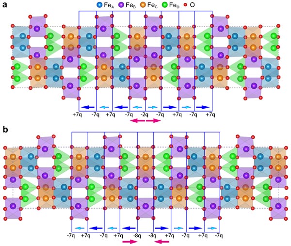 為了探索疇壁處的新穎界面現(xiàn)象與物性,中國科學(xué)院金屬研究所沈陽材料科學(xué)國家研究中心材料結(jié)構(gòu)與缺陷研究部的相關(guān)團(tuán)隊(duì),圍繞磁電多鐵材料中鐵電疇壁處的鐵電極化行為和磁性耦合機(jī)制開展了系統(tǒng)性的研究工作,發(fā)現(xiàn) -Fe2O3中疇壁處的鐵電極化行為受束縛電荷密度的調(diào)控。研究表明, -Fe2O3薄膜中存在兩種類型的180 尾對(duì)尾鐵電疇壁。透射電鏡原子結(jié)構(gòu)表征的結(jié)果表明,在I型疇壁處出現(xiàn)了罕見的鐵電極化顯著增強(qiáng)(約43%)現(xiàn)象(如圖2所示),而在II型疇壁處的鐵電極化強(qiáng)度減弱至接近于零(如圖3所示)。第一性原理計(jì)算表明,I型疇壁處束縛電荷密度低,從而導(dǎo)致其鐵電極化增強(qiáng);II型疇壁處的束縛電荷密度高,從而導(dǎo)致其鐵電極化減弱(如圖4所示)。I型和II型鐵電疇壁處的磁性耦合方式分別為反鐵磁性耦合和鐵磁性耦合(如圖5所示),它們對(duì) -Fe2O3的磁學(xué)性能具有重要影響。該研究表明磁電多鐵材料中疇壁處的鐵電極化可表現(xiàn)出顯著增強(qiáng)的現(xiàn)象,鐵電疇壁在其磁學(xué)性能方面也發(fā)揮著重要作用,這不僅深化了人們對(duì)磁電多鐵材料中豐富物理現(xiàn)象與行為的認(rèn)識(shí),還為提升其性能及推進(jìn)其實(shí)際應(yīng)用提供了新思路。