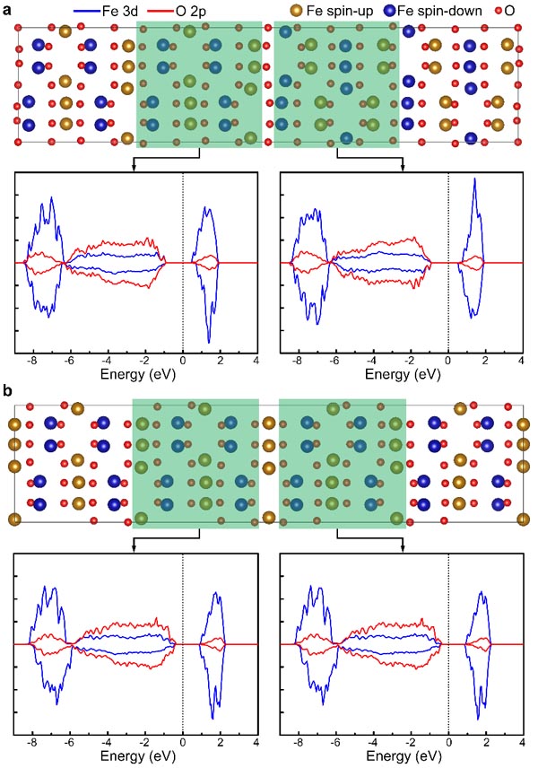 圖5. (a)I型疇壁的態(tài)密度圖,(b)II型疇壁的態(tài)密度圖。I型疇壁兩側(cè)的磁矩為反平行排列,形成反鐵磁性耦合;II型疇壁兩側(cè)的磁矩為平行排列,形成鐵磁性耦合。