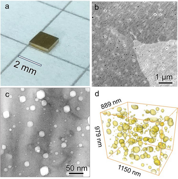 圖1. 納米孔彌散強(qiáng)化金(NVD Au):(a)樣品實(shí)物圖;(b)典型掃描電鏡照片;(c)透射電鏡照片;(d)三維重構(gòu)圖顯示納米孔的空間分布。