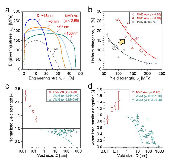 該團(tuán)隊(duì)通過(guò)脫合金腐蝕法制備出結(jié)構(gòu)均勻的納米多孔金,將其適當(dāng)壓縮并加熱退火,形成一種含有大量彌散分布納米孔的新材料(圖1)。微拉伸實(shí)驗(yàn)發(fā)現(xiàn),添加體積分?jǐn)?shù)高達(dá)5%~10%的納米孔后,材料屈服強(qiáng)度提升50%~100%,且保持良好的塑性。部分樣品塑性甚至優(yōu)于同等晶粒尺寸的完全致密材料(圖2)。彌散分布納米孔有助于減輕孔洞周圍應(yīng)力和應(yīng)變集中,抑制裂紋的萌生。該材料巨大比表面積也促進(jìn)表面-位錯(cuò)間交互作用,進(jìn)而提高強(qiáng)度的同時(shí)也提高應(yīng)變硬化率,后者有助于提高塑性。該研究表明,特征尺寸低于百納米的孔洞具有類似于納米顆?;蚣{米析出相的強(qiáng)化效應(yīng),是一種“零質(zhì)量、零污染”的新型納米強(qiáng)化相。這一強(qiáng)化方式不僅有助于材料輕量化和回收再利用,且可更大限度保留本體材料導(dǎo)熱導(dǎo)電等優(yōu)異物理性能,有可能在多個(gè)領(lǐng)域獲得應(yīng)用。