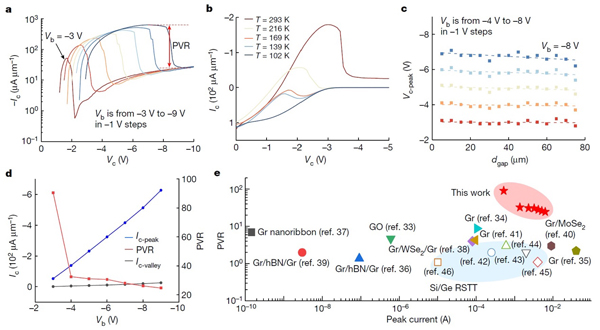 a. 輸出特性曲線;b. 輸出特性中電流的溫度依賴性;c. 峰值電流偏壓與縫隙寬度關(guān)系圖;d. 峰谷電流比;e. 峰谷電流比性能對(duì)比圖。
