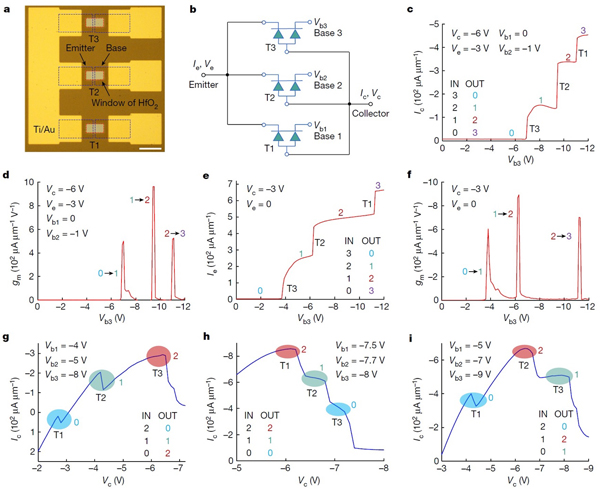 a. 電路光鏡圖;b. 等效電路圖;c. 集電極電流作為輸出的四值數(shù)字邏輯反向器;d. 集電極電流對(duì)應(yīng)的跨導(dǎo);e.發(fā)射極電流作為輸出的四值數(shù)字邏輯反向器;f. 發(fā)射極電流對(duì)應(yīng)的跨導(dǎo);g. 三值反向器;h.三值跟隨器;i. 三值加法器元件。