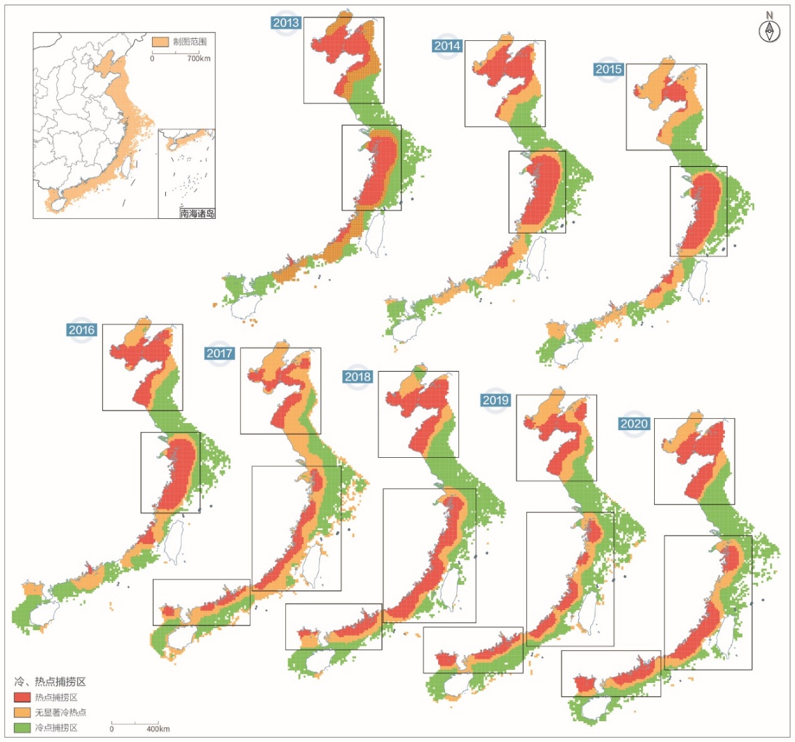 圖1. 中國(guó)大陸沿海冷熱點(diǎn)漁業(yè)捕撈區(qū)(Geng et al.,?2023)