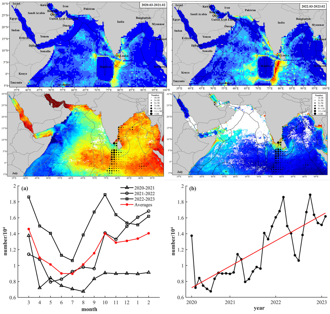 基于船舶AIS及衛(wèi)星遙感數(shù)據(jù)在北印度洋的觀測(cè)研究表明(Li et al.,?2024),北印度洋漁船高度集中在馬爾代夫、阿曼等專屬經(jīng)濟(jì)區(qū)外圍印度洋公海、保克海峽、印度近岸海域,塞舌爾群島海域及巴林灣的捕撈區(qū)和開(kāi)放式養(yǎng)殖用海海域。北印度洋漁業(yè)活動(dòng)有明顯的季節(jié)性,每年7月漁業(yè)活動(dòng)強(qiáng)度最低,與臺(tái)風(fēng)活動(dòng)以及高溫有關(guān)。受COVID-19疫情影響,2020年海上漁船數(shù)據(jù)急劇下降;隨后至2023年,漁船活動(dòng)熱度逐年上升。
