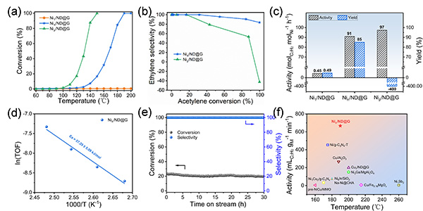 圖2. (a-c)乙炔加氫催化性能測(cè)試 (d)催化劑活化能 (e)穩(wěn)定性能測(cè)試 (f)與其他乙炔加氫催化劑的比較