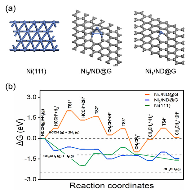 圖3.(a)Ni顆粒、Ni團(tuán)簇和Ni單原子催化劑的模型 (b)不同催化劑表面乙炔加氫反應(yīng)過(guò)程路徑計(jì)算