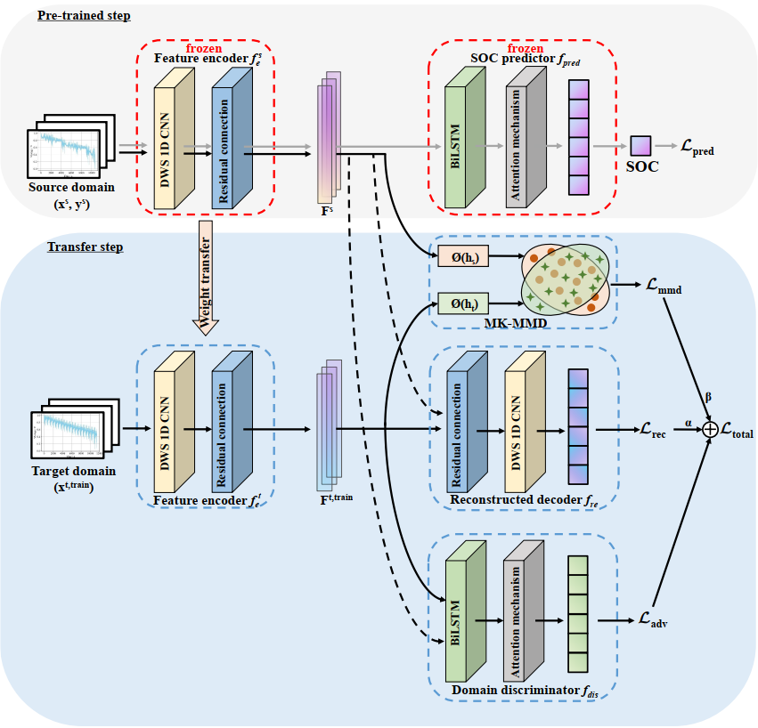 相關(guān)研究成果以“An unsupervised domain adaptation framework for cross-conditions state of charge estimation of lithium-ion batteries”為題,于近日發(fā)表在《電氣電子工程師學(xué)會交通電氣化學(xué)報》(IEEE Transactions on Transportation Electrification)上。該工作的第一作者是大連化物所博士后劉云鵬,該工作得到國家自然科學(xué)基金、中國科學(xué)院B類先導(dǎo)專項“能源電催化的動態(tài)解析與智能設(shè)計”、中央高?;究蒲袠I(yè)務(wù)費專項科研基金等項目的資助。