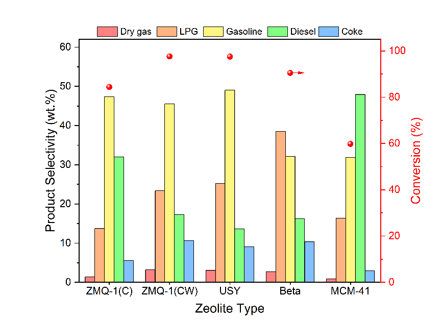 此外,ZMQ-1分子篩具有高的熱和水熱穩(wěn)定性、豐富的中強(qiáng)B酸位點(diǎn)。在重油催化裂化反應(yīng)中,與商業(yè)化沸石分子篩催化劑相比,含磷ZMQ-1沸石分子篩表現(xiàn)出對輕質(zhì)燃料(汽油和柴油)較高的選擇性,并且產(chǎn)生的焦炭、液化石油氣和干氣等產(chǎn)物也較少(圖2)。這一新型沸石分子篩的成功制備,為分子篩材料領(lǐng)域的發(fā)展提供了新的思路和方向。其獨(dú)特的介孔結(jié)構(gòu)和穩(wěn)定的化學(xué)性質(zhì)有望在大尺寸分子催化轉(zhuǎn)化和吸附分離工業(yè)應(yīng)用中發(fā)揮重要作用。