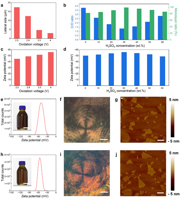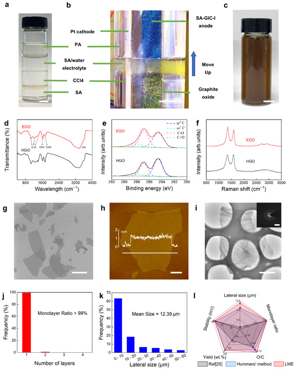 針對上述問題,任文才團(tuán)隊(duì)深入研究了電解水制備GO的機(jī)制,發(fā)現(xiàn)環(huán)境和電解液中水的吸附導(dǎo)致插層石墨原料的脫插層是非均勻氧化的根源,而電解水氧化與水吸附脫插層均受到水從電解液向插層石墨擴(kuò)散過程的控制,兩者的競爭決定了插層石墨能否得到均勻氧化?;谠摾斫?,他們發(fā)明了微液膜電解(LME)方法精確控制水的擴(kuò)散,有效實(shí)現(xiàn)了電解水氧化與水吸附脫插層的動態(tài)平衡,從而實(shí)現(xiàn)了均一單層GO的工業(yè)化連續(xù)制備。GO的單層率≥99%,產(chǎn)率可達(dá)~180 wt.%,而成本僅為Hummers方法的1/7。并且,利用LME方法可以實(shí)現(xiàn)對GO氧化程度和尺寸的有效控制以及利用純水電解制備GO。?