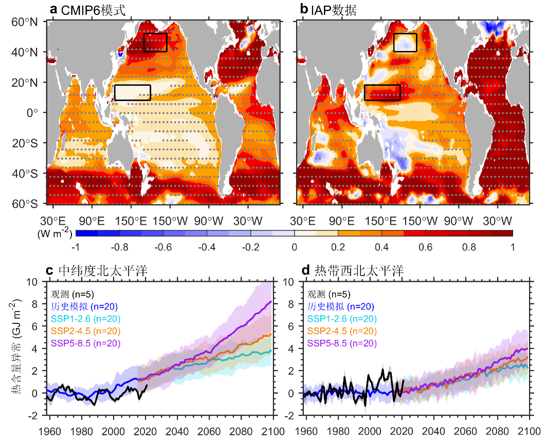 溫室氣體排放導致的地球系統(tǒng)能量增加中有90%以上被海洋吸收,但海洋熱量存儲在地理上并不均勻,對區(qū)域氣候和人類社會產(chǎn)生了廣泛影響。第六次國際氣候模式比較計劃CMIP6表明中緯度北太平洋的熱量存儲顯著增加,熱帶西北太平洋的儲熱變化最弱(圖1a)。然而,觀測到的北太平洋熱存儲格局更加復(fù)雜,與CMIP6集合平均呈現(xiàn)明顯差異(圖1),在熱帶西北太平洋具有最強變暖,在中緯度北太平洋變暖有限甚至變冷。由于CMIP6集合平均主要表示外強迫變化,北太平洋熱存儲格局的模擬-觀測差異可能源于模式對外強迫驅(qū)動的熱存儲存在系統(tǒng)模擬偏差,或者源于自然變率主導觀測的熱存儲格局。