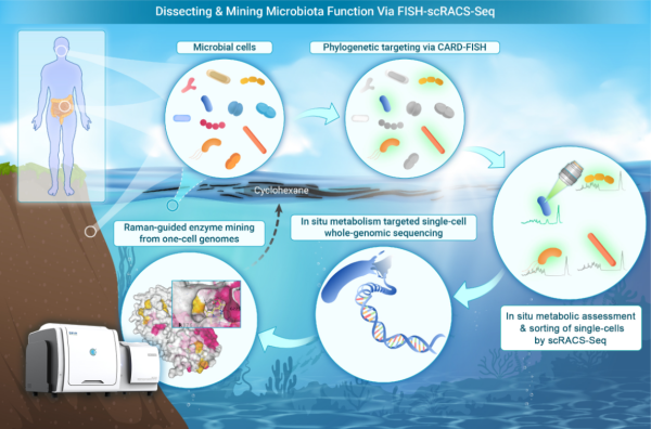 該研究開發(fā)出“雙管齊下”的FISH-scRACS-seq技術(shù)。這一技術(shù)利用熒光原位雜交,基于熒光標(biāo)記的物種靶向性DNA序列雜交探針,識別出菌群中目標(biāo)物種的微生物細(xì)胞。在此基礎(chǔ)上,研究通過單細(xì)胞拉曼光譜表征這些目標(biāo)物種細(xì)胞的原位代謝功能,進(jìn)而“物種-代謝”雙靶向、一一對應(yīng)地分選出目標(biāo)物種和目標(biāo)代謝功能的單細(xì)胞并測定其全基因組序列,解析其代謝機(jī)制并獲取基因組上編碼的功能元件。