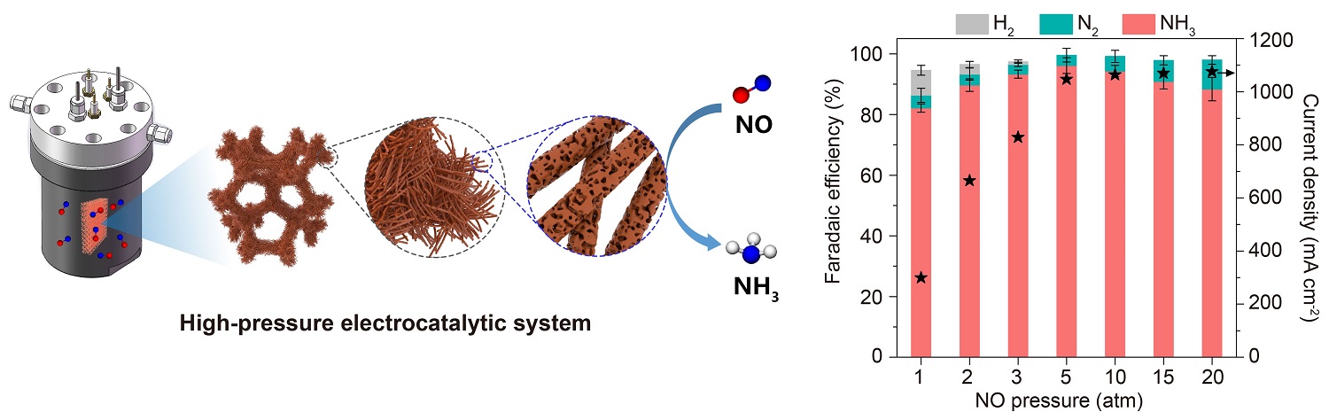 近日,大連化物所催化基礎國家重點實驗室能源與環(huán)境小分子催化研究中心(509組群)鄧德會研究員、崔曉菊副研究員、于良研究員團隊在一氧化氮電催化合成氨的研究中取得新進展。團隊創(chuàng)新性地構建了高壓-電催化體系,并開發(fā)出具有獨特三維多級孔結構的整體式Cu納米線陣列催化劑,實現(xiàn)了安培級電流密度下高效、長壽命的一氧化氮電催化合成氨。該工作為工業(yè)廢氣中一氧化氮污染物的資源化利用和綠色可持續(xù)的電合成氨工藝提供了新思路。