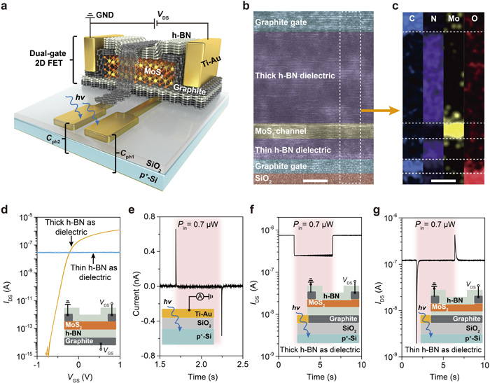 在這項研究中,研究團隊設計了一種“上下雙光敏電容”的柵極結構,上層柵極通過較厚的介電層屏蔽電子,使器件產(chǎn)生穩(wěn)定的電流變化,用于采集灰度圖像;下層柵極通過較薄的介電層讓電子隧穿形成瞬態(tài)電流脈沖,專門用來捕捉動態(tài)事件。通過這種獨特的電荷耦合光柵機制,研究人員首次在一個晶體管內(nèi)實現(xiàn)了靜態(tài)圖像與動態(tài)事件的獨立響應。實測結果表明,該器件動態(tài)范圍達到120 dB、響應速度快至15 μs、功耗僅為10 pW,僅為傳統(tǒng)DAVIS器件的千分之一。這不僅顯著降低了功耗,還有助于大規(guī)模集成,同時也從根本上解決了高速時鐘同步難題。更值得一提的是,該發(fā)明具備良好的材料普適性,既可以用二維材料制造,也可以采用一維的碳納米管。未來,研究團隊將探索該技術與硅基工藝結合,使用32 nm先進制程,有望在1×1 c㎡的芯片上實現(xiàn)千萬級像素的高密度集成。