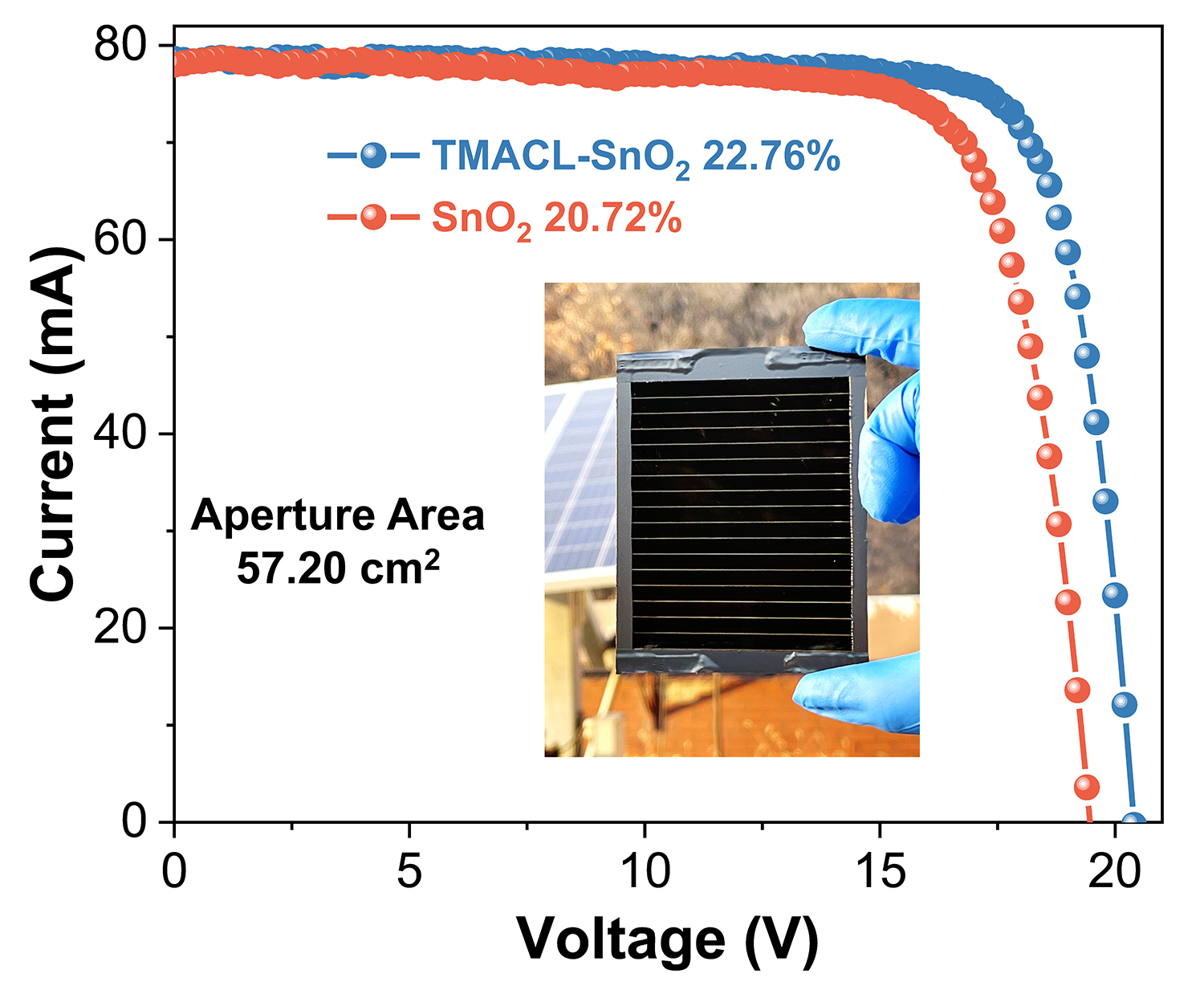鈣鈦礦太陽能電池憑借高效率、低成本等優(yōu)勢,被視為是下一代光伏技術(shù)的核心。在產(chǎn)業(yè)化中,適合大面積連續(xù)生產(chǎn)的涂布印刷工藝是首選技術(shù)路線。然而,作為電子傳輸層的氧化錫(SnO2)納米顆粒在涂布過程中易發(fā)生團聚,導(dǎo)致薄膜不均勻,進而引發(fā)鈣鈦礦層結(jié)晶缺陷和界面電荷傳輸障礙,制約了電池性能的提升。