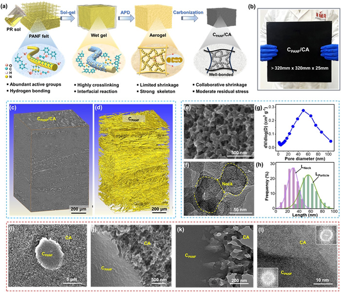 近年來(lái),中國(guó)科學(xué)院金屬研究所研究員湯素芳團(tuán)隊(duì)致力于碳?xì)饽z強(qiáng)韌性、抗氧化及大尺寸成型研究,取得了系列進(jìn)展。該團(tuán)隊(duì)在前期工作的基礎(chǔ)上,受天然生物材料多尺度復(fù)合和梯度過(guò)渡界面結(jié)構(gòu)的啟發(fā),聯(lián)合研究員劉增乾、張哲峰以及美國(guó)加州大學(xué)伯克利分校的研究人員提出了柔性有機(jī)纖維-有機(jī)氣凝膠基體的協(xié)同界面調(diào)控策略,并研制出高強(qiáng)高損傷容限大尺寸碳?xì)饽z材料。