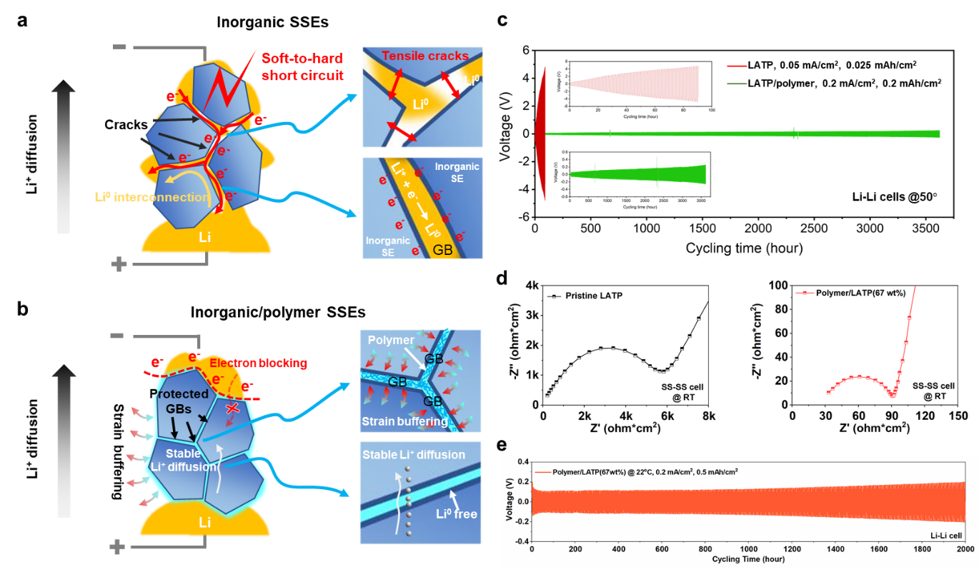 基于這些發(fā)現(xiàn),研究團隊利用三維電子絕緣且機械彈性的聚合物網(wǎng)絡,發(fā)展了無機/有機復合固態(tài)電解質(zhì),有效抑制了固態(tài)電解質(zhì)內(nèi)部的鋰金屬析出、互連及其誘發(fā)的短路失效,顯著提升了其電化學穩(wěn)定性。該研究通過闡明固態(tài)電解質(zhì)的軟短路-硬短路轉(zhuǎn)變機制及其與析鋰動力學的內(nèi)在關(guān)聯(lián),為固態(tài)電解質(zhì)的納米尺度失效機理提供了全新認知,為新型固態(tài)電解質(zhì)的開發(fā)提供了理論依據(jù)。該研究也凸顯出先進透射電子顯微術(shù)在解決能源領域關(guān)鍵科學問題方面扮演的重要角色。
