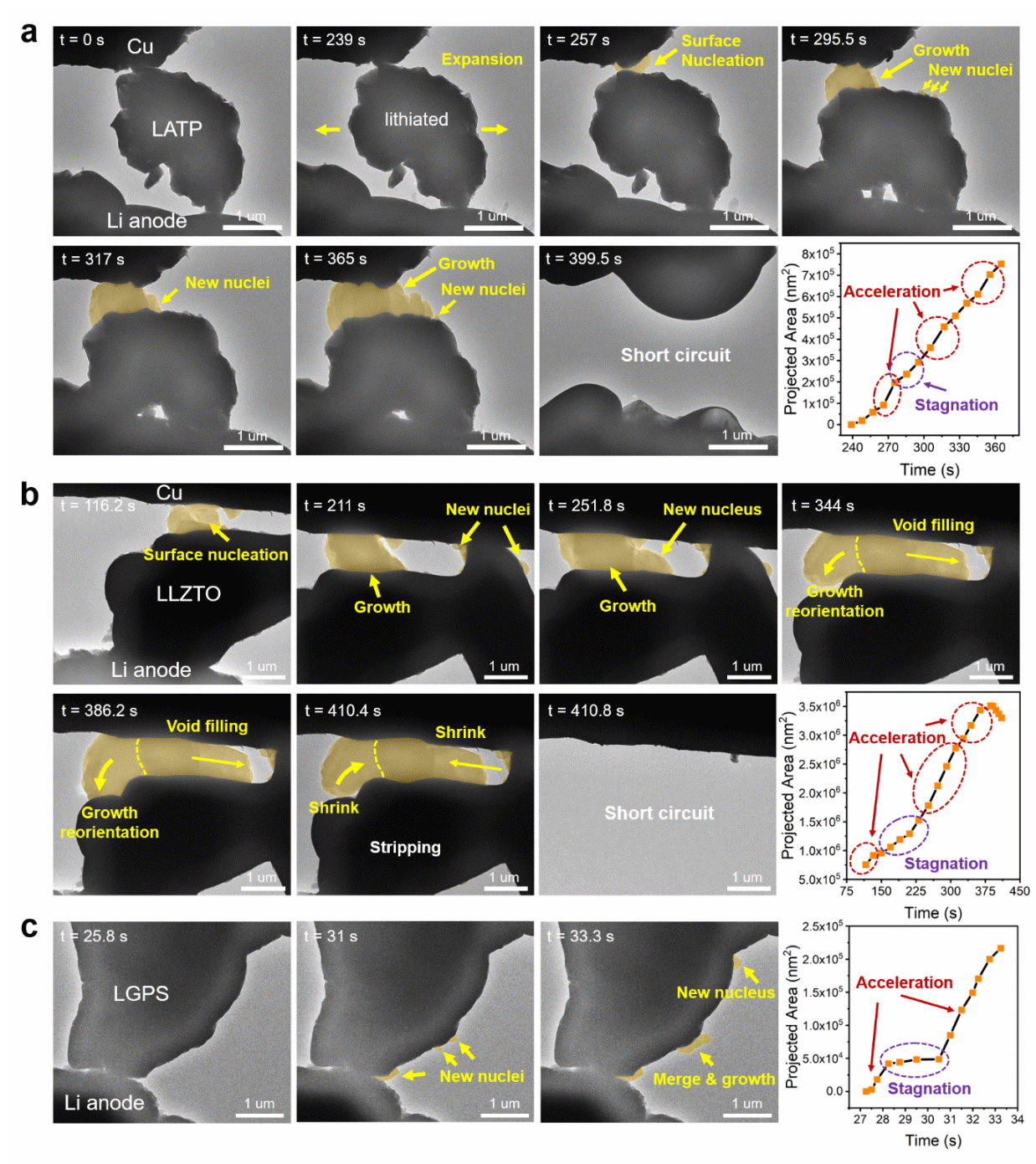 圖2. 鋰金屬析出—電解質(zhì)短路動力學的原位電鏡觀察