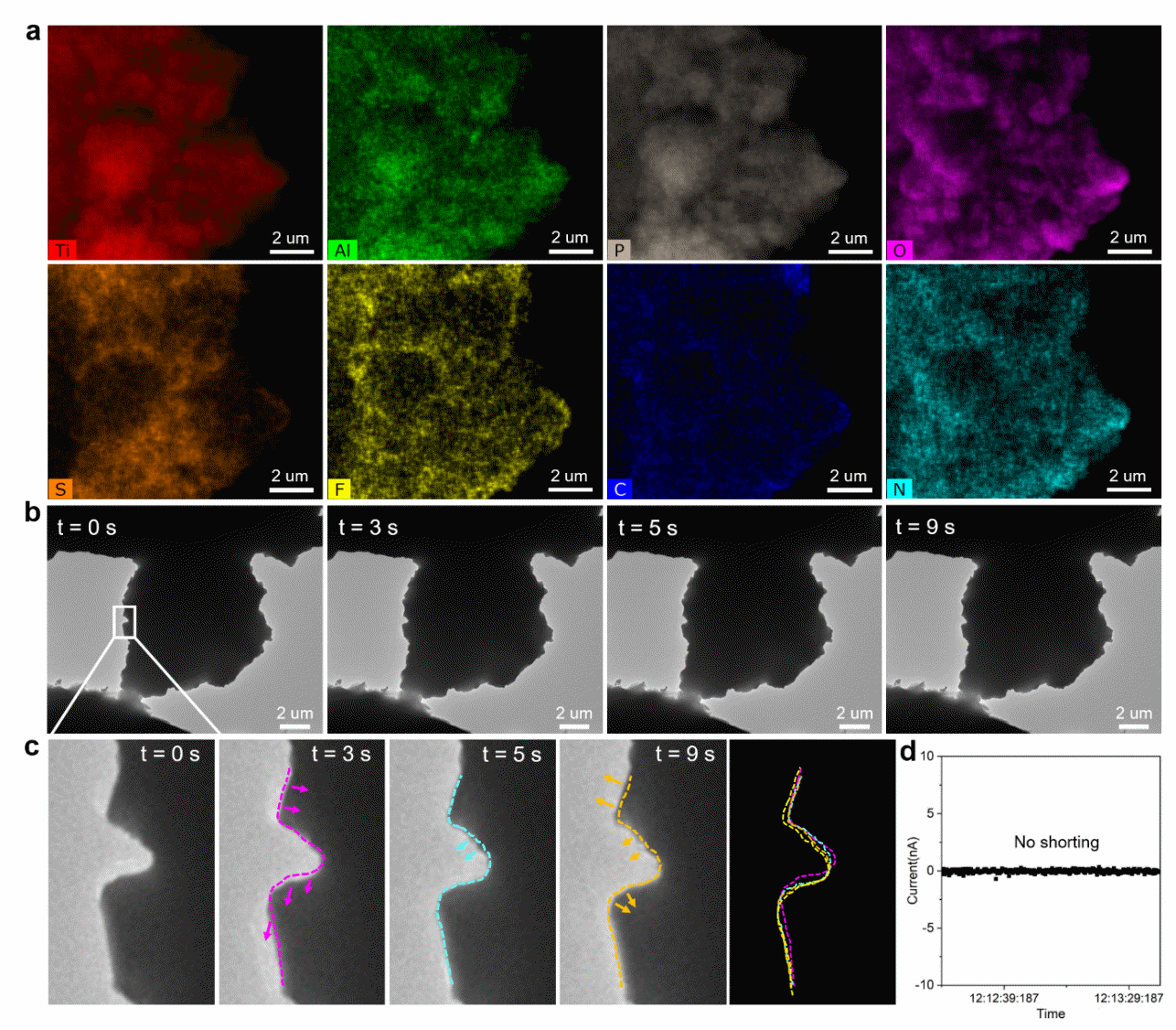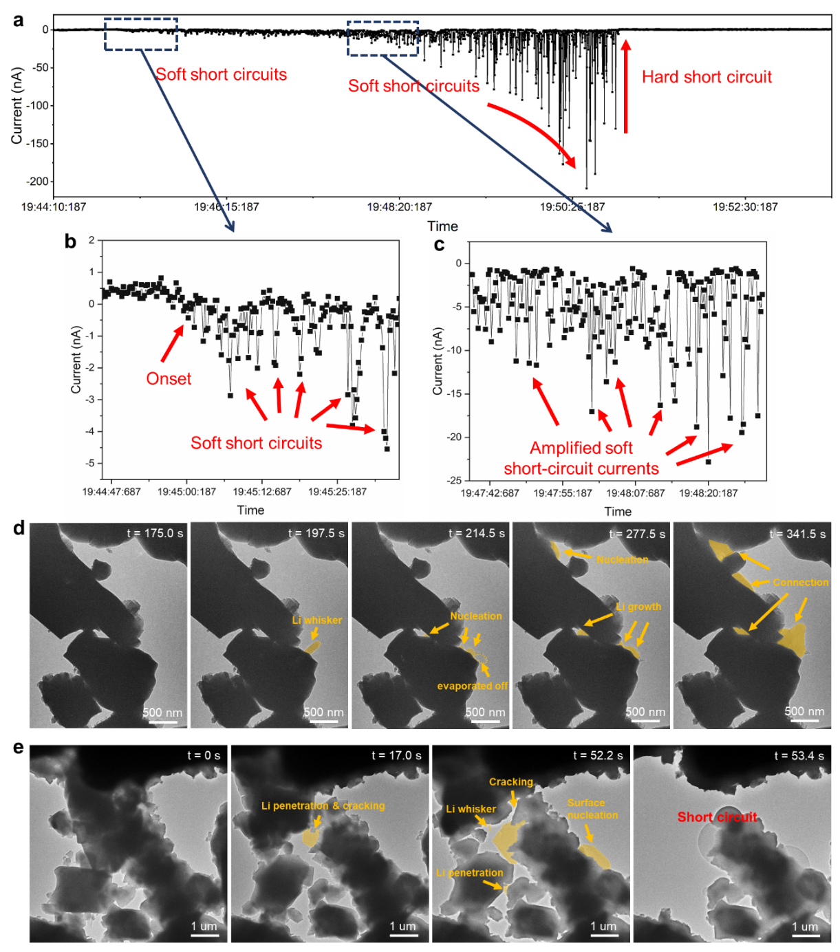 圖3. 軟短路—硬短路的轉(zhuǎn)變動力學的原位電鏡觀察和短路電流監(jiān)測