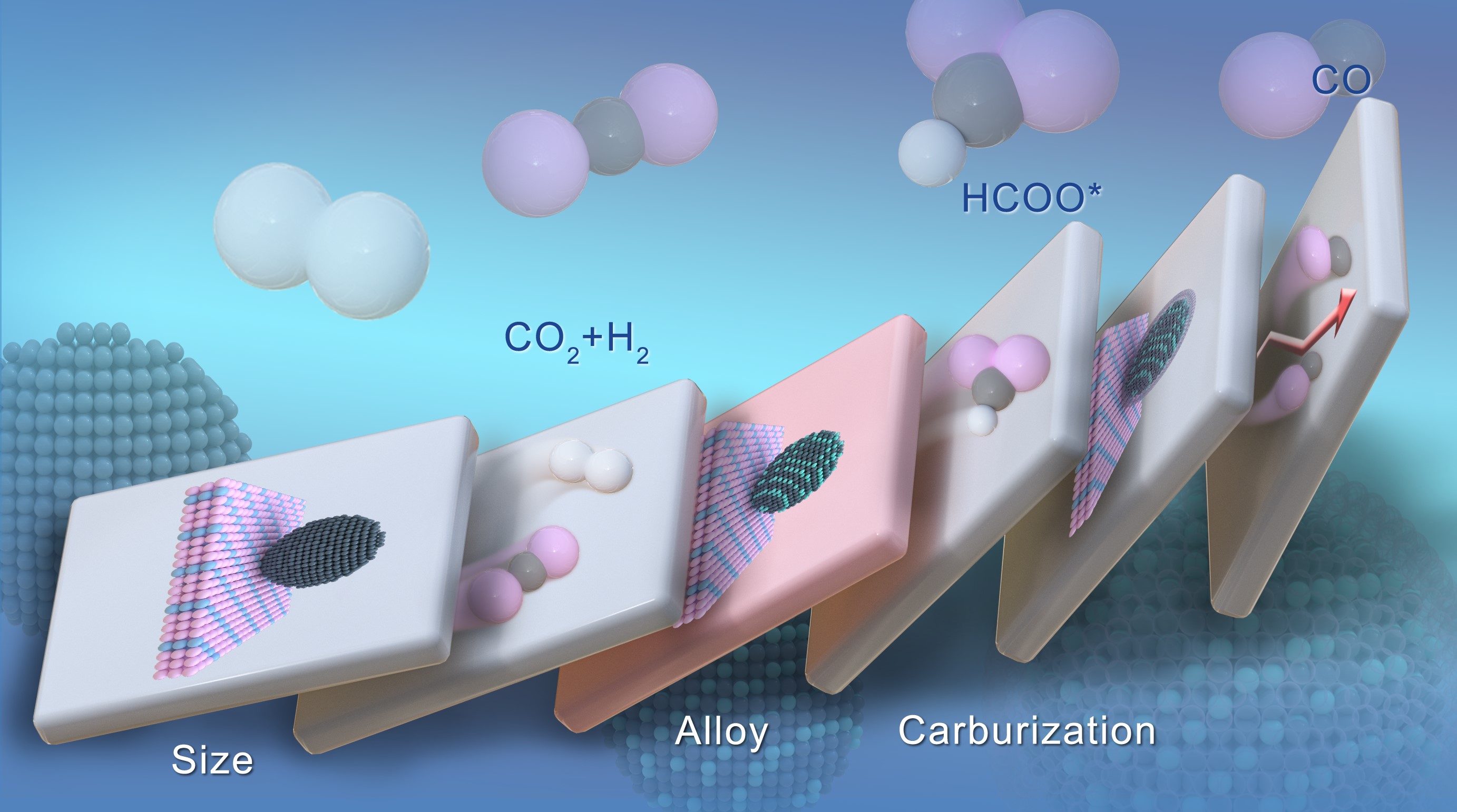 這些結(jié)果揭示了催化劑動態(tài)結(jié)構(gòu)演化的復(fù)雜性及其與反應(yīng)進程、反應(yīng)網(wǎng)絡(luò)之間的交互耦合機制,闡明了“金屬粒徑→反應(yīng)氣→界面重構(gòu)→反應(yīng)中間體→動態(tài)碳化→反應(yīng)產(chǎn)物”的鏈?zhǔn)蕉嗝字Z效應(yīng)。通過解耦這一復(fù)雜動態(tài)過程,研究人員發(fā)現(xiàn),相比于尺寸效應(yīng)和金屬-載體相互作用,合金化過程才是加速催化劑碳化從而提高反應(yīng)活性的關(guān)鍵因素。基于這一認(rèn)識,團隊進一步設(shè)計出具備高活性、短誘導(dǎo)期的低載量0.5Pd3Fe/FeOx合金催化劑,提升了反應(yīng)性能及貴金屬利用率,實現(xiàn)了高性能CO2加氫反應(yīng)中催化劑的高效設(shè)計。該研究強調(diào)了原位解耦催化劑復(fù)雜動態(tài)演變的重要性,為發(fā)展原位結(jié)構(gòu)解析驅(qū)動的催化劑理性設(shè)計提供了范例。