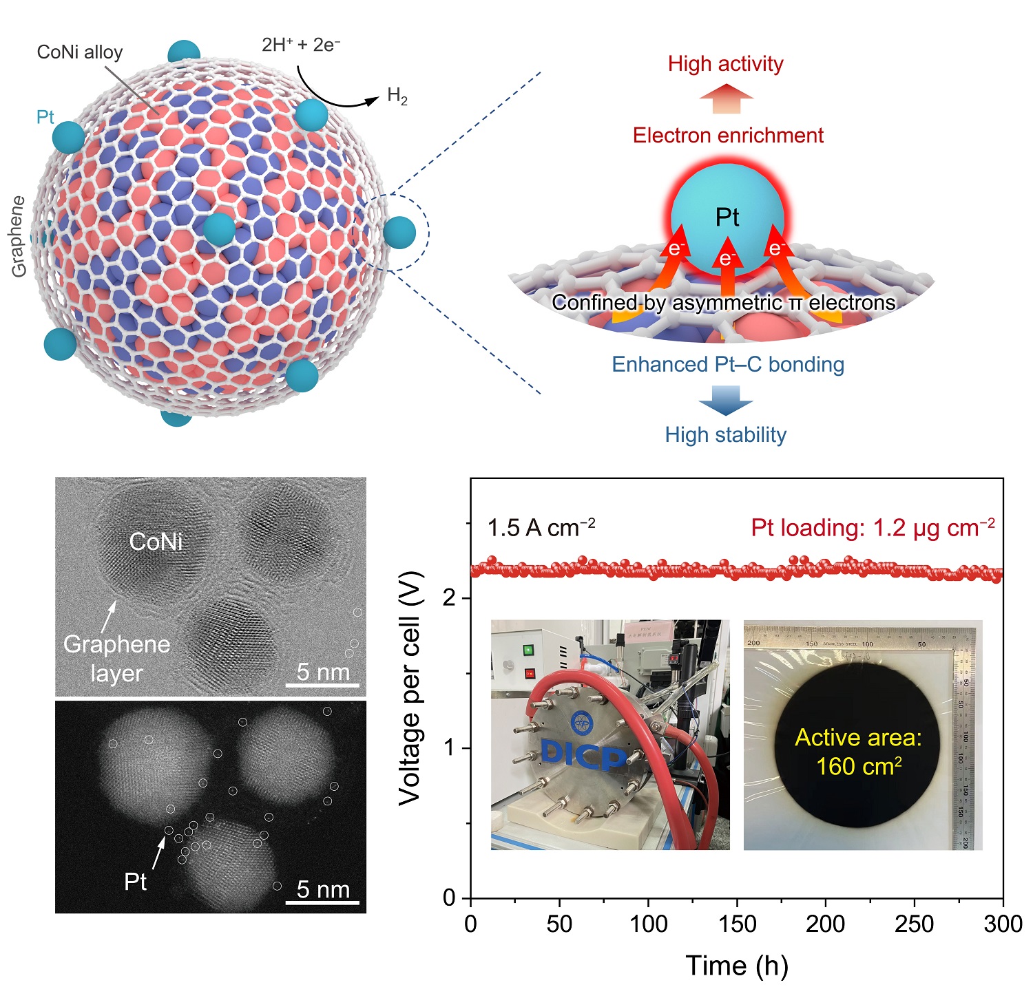 近日,大連化物所能源催化轉(zhuǎn)化全國(guó)重點(diǎn)實(shí)驗(yàn)室能源與環(huán)境小分子催化研究中心(509組群)鄧德會(huì)研究員和于良研究員團(tuán)隊(duì)與中國(guó)科學(xué)技術(shù)大學(xué)路軍嶺教授團(tuán)隊(duì)、大連化物所高效電解水制氫研究組(DNL0325組)俞紅梅研究員團(tuán)隊(duì)合作,發(fā)現(xiàn)鎧甲催化劑表面富集的不對(duì)稱π電子具有獨(dú)特的限域效應(yīng),可同時(shí)提升表面限域鉑(Pt)原子的活性和穩(wěn)定性?;诖?,合作團(tuán)隊(duì)設(shè)計(jì)合成了高活性、高穩(wěn)定性的電解水制氫催化劑,并組裝了千瓦級(jí)質(zhì)子交換膜電解槽,實(shí)現(xiàn)了超低Pt載量、工業(yè)大電流密度下的高效酸性電解水制氫。