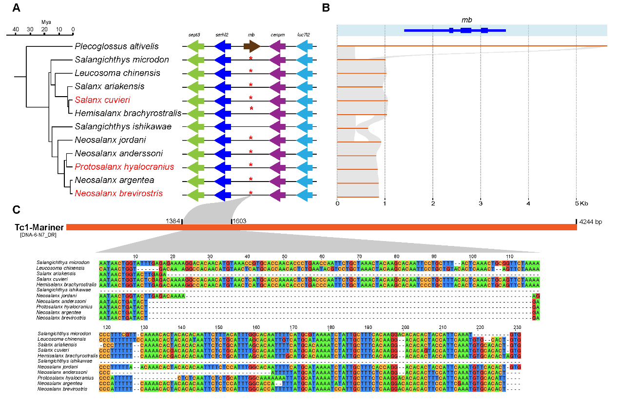 研究表明,銀魚血氧運輸相關(guān)基因的丟失與退化,與其歷史偶然性及幼態(tài)持續(xù)特征密切相關(guān)。轉(zhuǎn)座介導(dǎo)的銀魚共同祖先肌紅蛋白基因的丟失可能是一個關(guān)鍵的偶然事件,進(jìn)而其對生理演化形成了一定的約束,卻同時促進(jìn)了幼態(tài)持續(xù)特征的演化。幼態(tài)持續(xù)賦予銀魚細(xì)長的身體結(jié)構(gòu)、小體型、軟骨、無鱗和高透氣性皮膚,使其在缺乏傳統(tǒng)血氧運輸系統(tǒng)關(guān)鍵蛋白的情況下仍然可以生存并繁衍。相比之下,同為無紅血代表的南極冰魚則經(jīng)歷了完全不同的演化路徑:其共同祖先經(jīng)歷了血紅蛋白基因的幾乎完全丟失,隨后其肌紅蛋白基因也獨立演化退化。在選擇壓力放松的環(huán)境下,這兩個魚類類群都積累了一系列隨機(jī)的、導(dǎo)致基因功能喪失的突變,尤其是血氧運輸系統(tǒng)相關(guān)基因。盡管銀魚與南極冰魚在自然選擇的作用下各自演化出一些可以增強(qiáng)心血管功能的遺傳變化,以部分補(bǔ)償氧氣運輸與儲存效率的降低,但兩者在相關(guān)基因上的重疊較少,顯示出演化的獨立性。不過它們在分子機(jī)制上卻存在一致性,均共享轉(zhuǎn)座子介導(dǎo)的突變作為血氧運輸系統(tǒng)關(guān)鍵基因退化的主要驅(qū)動力。