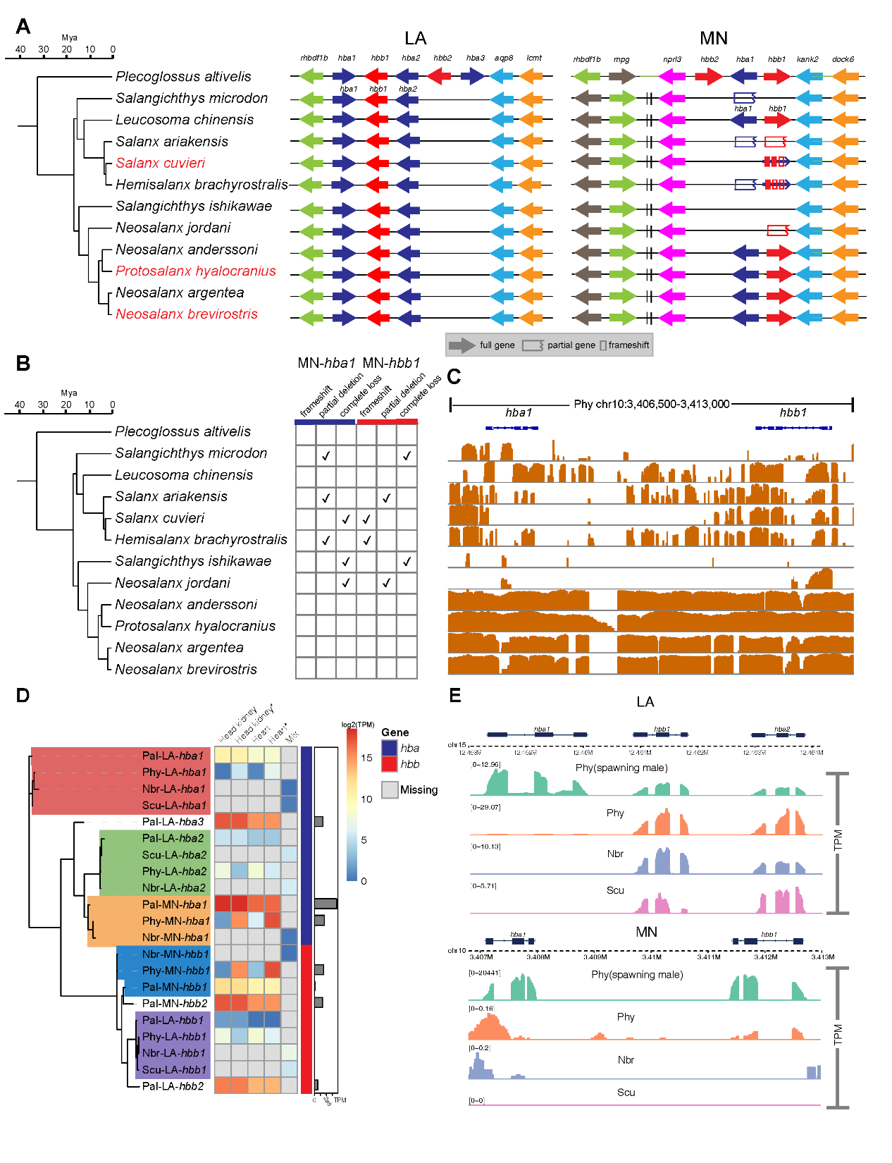 劉進(jìn)賢團(tuán)隊通過高質(zhì)量基因組測序與比較基因組學(xué)分析,系統(tǒng)揭示了銀魚科內(nèi)部物種分化之前便完全丟失了肌紅蛋白基因(圖1),作為具有重要生理功能的基因和蛋白,該丟失在脊椎動物中極為罕見。進(jìn)一步研究發(fā)現(xiàn),轉(zhuǎn)座子介導(dǎo)的插入突變是基因丟失的主要分子機(jī)制,而非自然選擇作用。此外,研究還發(fā)現(xiàn)血氧運輸系統(tǒng)中的核心基因——血紅蛋白基因——在不同銀魚物種中經(jīng)歷了不同程度的獨立退化,且這一過程發(fā)生在肌紅蛋白基因丟失之后(圖2)。由于血紅蛋白的不表達(dá)導(dǎo)致選擇壓力的放松,銀魚血氧運輸系統(tǒng)中其他相關(guān)基因,如游離血紅蛋白清除基因和紅血細(xì)胞生成相關(guān)基因,也發(fā)生了不同程度的獨立退化。