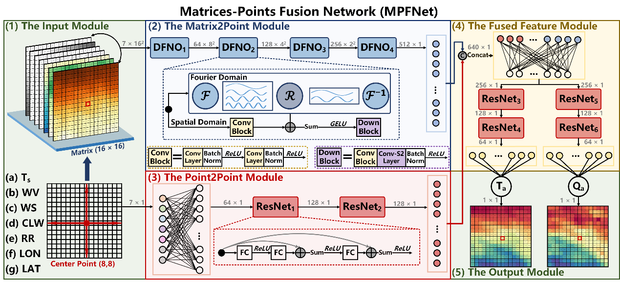 本研究聚焦于提升海表面2米氣溫(Ta)和比濕(Qa)的遙感反演精度,這兩個(gè)變量是計(jì)算海氣感熱通量(SHF)和潛熱通量(LHF)的關(guān)鍵輸入,但傳統(tǒng)方法往往面精度低、區(qū)域偏差大等問題。為此,研究團(tuán)隊(duì)創(chuàng)新性地提出了MPFNet(Matrices-Points Fusion Network),融合關(guān)鍵點(diǎn)特征和周圍空間矩陣信息,結(jié)合Fourier神經(jīng)算子與殘差網(wǎng)絡(luò)架構(gòu),實(shí)現(xiàn)了高精度的Ta與Qa反演。