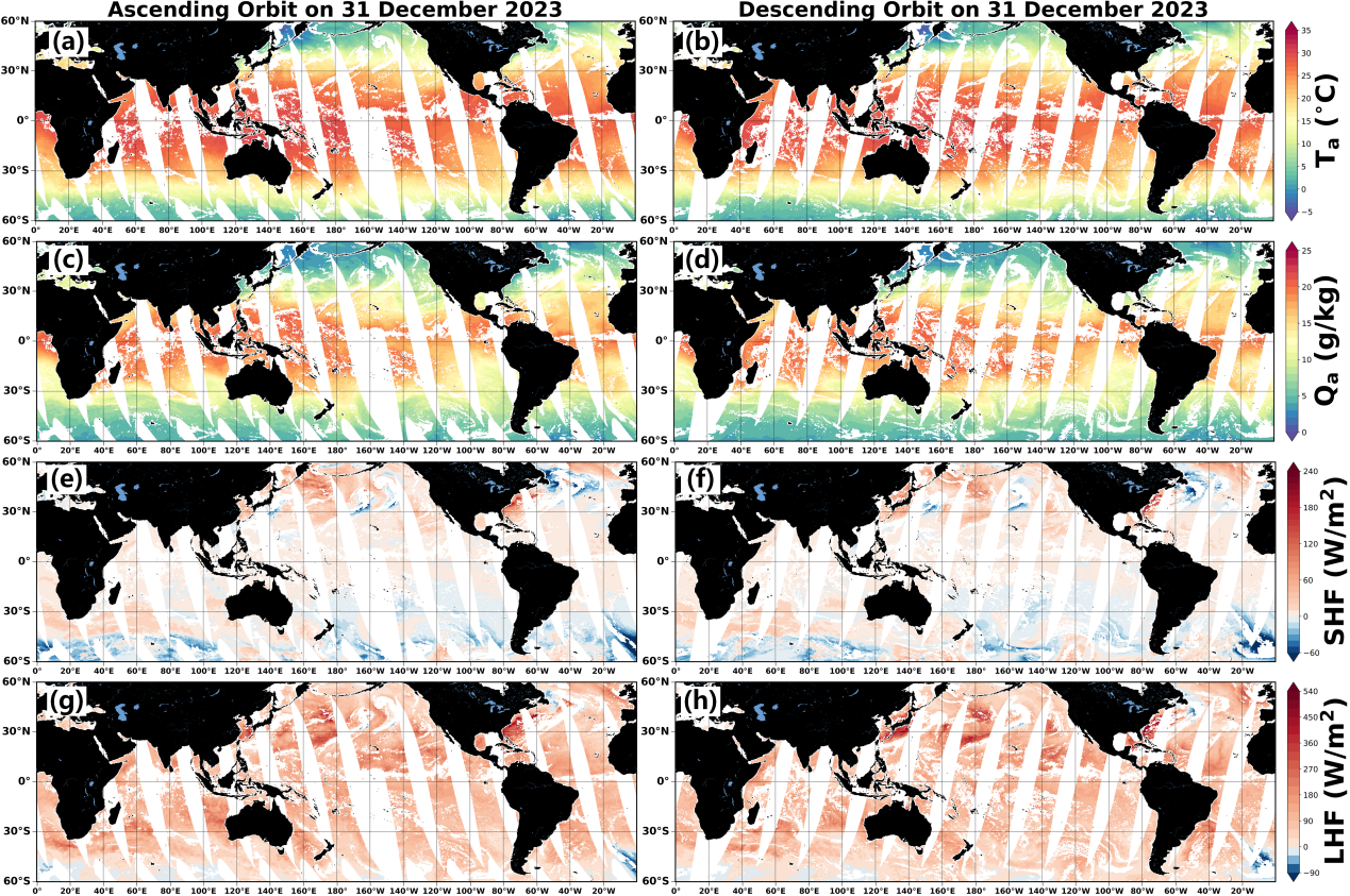 此外,研究團(tuán)隊(duì)基于MPFNet生成了覆蓋11.5年(2012.7–2023.12)分辨率為0.25°的全球逐日Ta、Qa、SHF和LHF產(chǎn)品,為精細(xì)化海氣通量估算、氣候變化監(jiān)測和極端天氣預(yù)測提供了高質(zhì)量數(shù)據(jù)支撐。