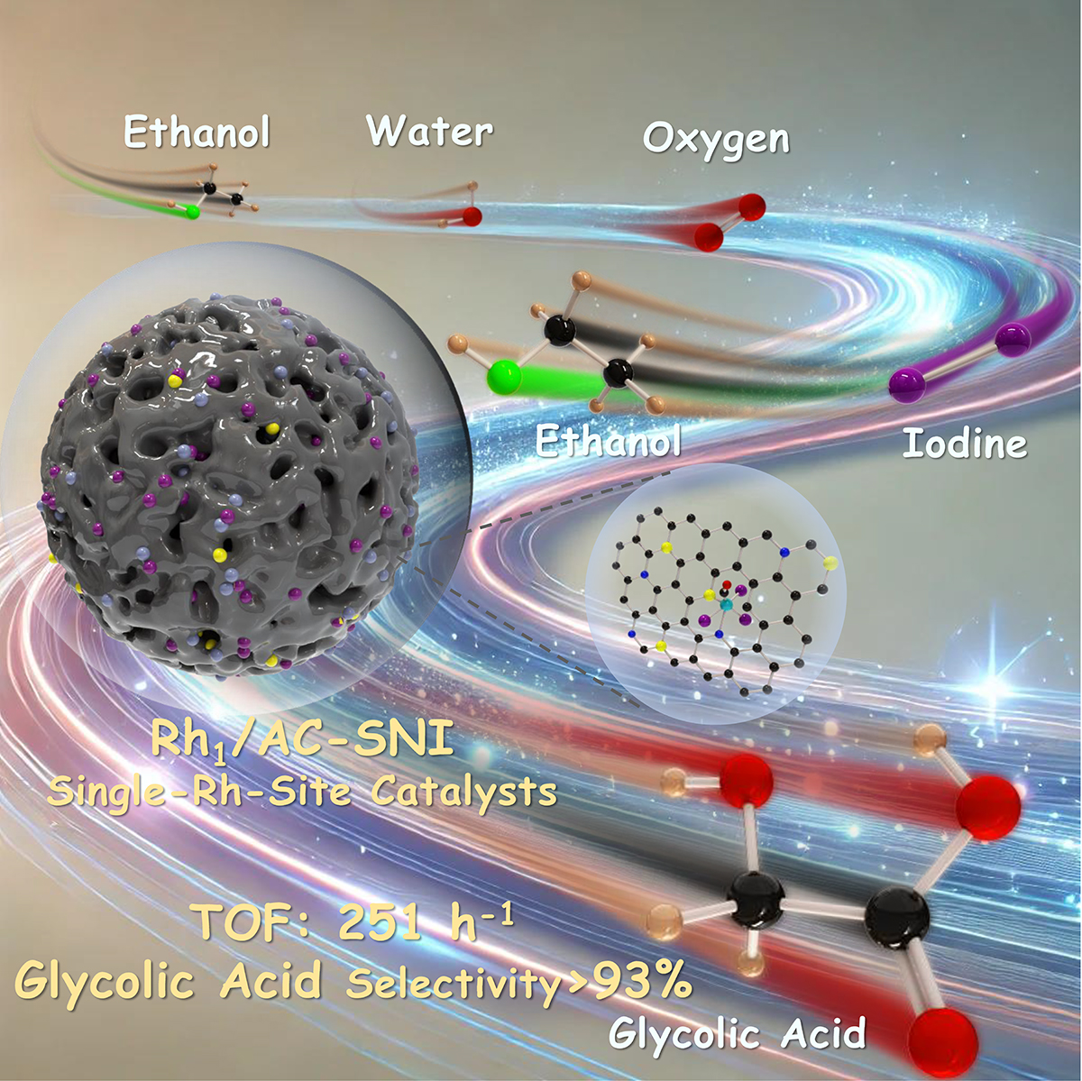 在本工作中,研究人員開(kāi)發(fā)了一種可控的單原子催化劑合成方法:通過(guò)調(diào)節(jié)載體預(yù)處理工藝,制備了活性炭上S/N/I配位的Rh單原子催化劑(Rh1/AC-SNI400)。實(shí)驗(yàn)結(jié)果表明,在160°C、I2和O2共同激發(fā)作用下,該催化劑可將乙醇直接氧化為乙醇酸,目標(biāo)產(chǎn)物選擇性為93%,周轉(zhuǎn)頻率(TOF)約為251 h-1。研究發(fā)現(xiàn),S/N/I的協(xié)同配位效應(yīng)提高了Rh周?chē)碾娮与x域性能,降低了底物吸附和決速步的能壘?;罨牡庾杂苫鶌Z取乙醇的β-C- H鍵,從而避免了乙醛副產(chǎn)物的生成。通過(guò)多項(xiàng)原位表征,研究人員揭示了一種新的水介導(dǎo)的氧穿梭機(jī)制:?I和?OH自由基依次奪取并插入乙醇的C–H鍵。高活性的?OH自由基能夠取代乙醇中原有的OH,形成C=O鍵,從而致使所有乙醇酸產(chǎn)物中的氧原子都來(lái)源于水分子。同時(shí),O2與?I和H物種反應(yīng)生成HIO,HIO分解生成H2O和O2,完成催化循環(huán)。