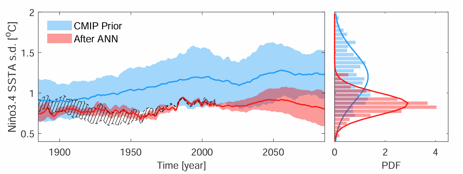 近日,中國(guó)科學(xué)院海洋研究所王凡團(tuán)隊(duì)攜手南京信息工程大學(xué)張榮華教授、嶗山實(shí)驗(yàn)室蔡文炬院士等,在Nature Communications發(fā)表題為“Projection of ENSO using observation-informed deep learning”的研究論文。該研究開創(chuàng)性地利用觀測(cè)數(shù)據(jù)約束的深度學(xué)習(xí)方法,顯著降低了全球關(guān)鍵氣候現(xiàn)象厄爾尼諾-南方濤動(dòng)(ENSO)未來變化預(yù)估的不確定性。
