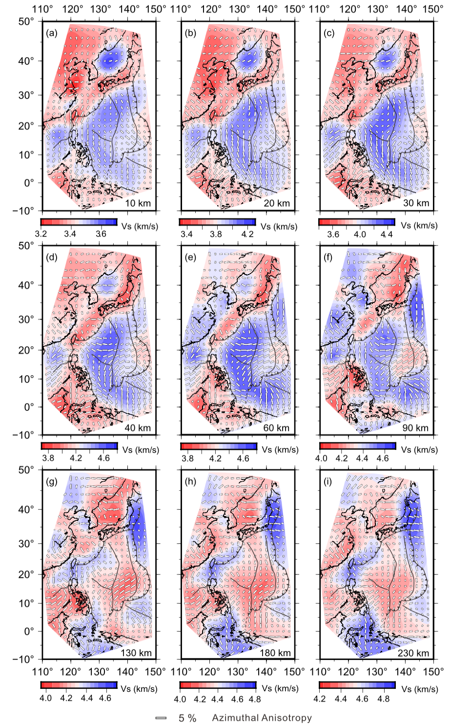 圖1 菲律賓海板塊及周邊殼幔橫波速度和方位各向異性