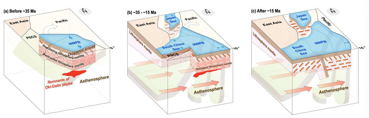 (a)第一階段:~35 Ma以前,西菲律賓海盆巖石圈正常擴張及下部巖石圈地幔破壞;(b)第二階段:~35 Ma-15 Ma,東向地幔流對南海海盆巖石圈地幔形成及西菲律賓海盆巖石圈地幔重形成的影響;(c)第三階段:15 Ma 以后,東向地幔流對南海和菲律賓海南部深部軟流圈的影響