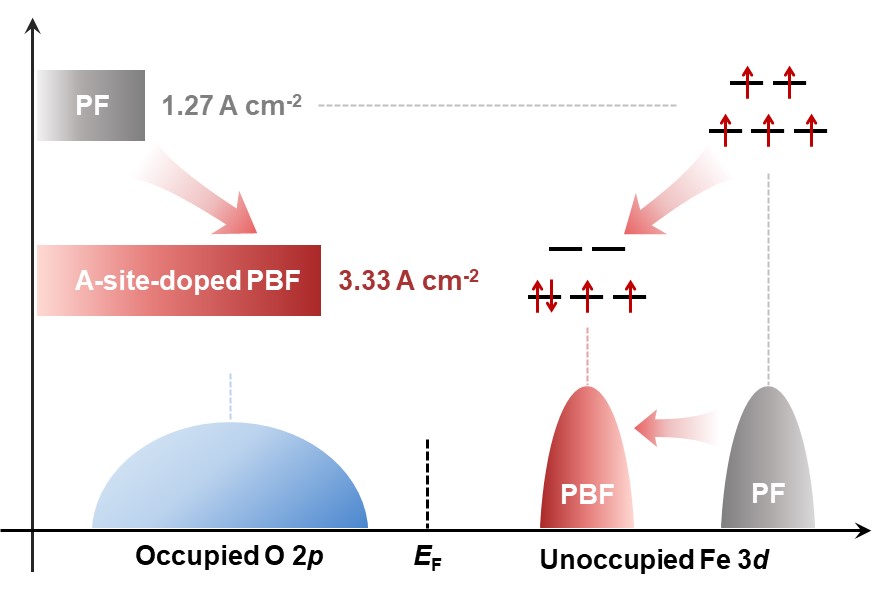 近日,大連化物所能源催化轉(zhuǎn)化全國重點(diǎn)實(shí)驗(yàn)室碳基資源電催化轉(zhuǎn)化研究組(523組)宋月鋒副研究員等聯(lián)合復(fù)旦大學(xué)汪國雄教授團(tuán)隊(duì),在固體氧化物電解池(SOEC)陽極高溫析氧反應(yīng)(OER)性能調(diào)控研究中取得新進(jìn)展。合作團(tuán)隊(duì)通過A位堿土金屬摻雜,系統(tǒng)揭示了PrFeO3?δ鈣鈦礦體系中電子自旋態(tài)對(duì)高溫OER性能的調(diào)控機(jī)制。
