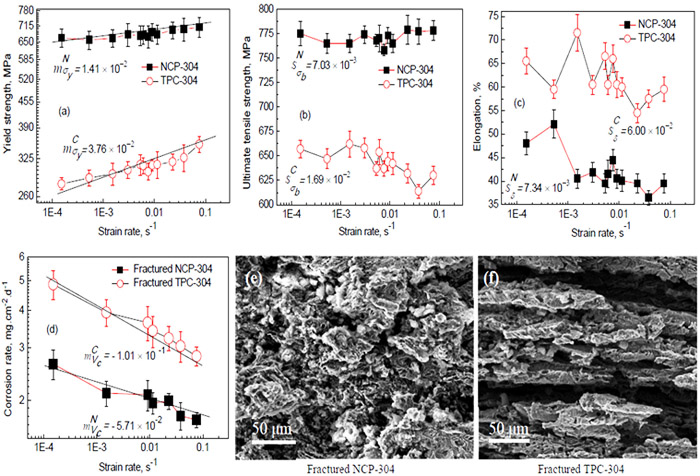 近期,研究人員發(fā)現(xiàn),與TPC-304相比(應(yīng)變速率1.52 × 10-4 s-1 - 7.60 × 10-2 s-1范圍內(nèi)),NCP-304屈服和抗拉強(qiáng)度分別提高303 MPa - 429 MPa和96 MPa - 166 MPa,延伸率為36.5% - 52.1%。NCP-304拉伸性能的應(yīng)變速率敏感性低于TPC-304。在2 mol/L HCl溶液中室溫浸泡25天,拉斷后的NCP-304耐點(diǎn)腐蝕性能提高,腐蝕速率小于拉斷后的TPC-304,腐蝕性能的應(yīng)變速率敏感性低于拉斷后的TPC-304。NCP-304 表面形變機(jī)理不變,TPC-304表面形變機(jī)理與應(yīng)變速率有關(guān)。