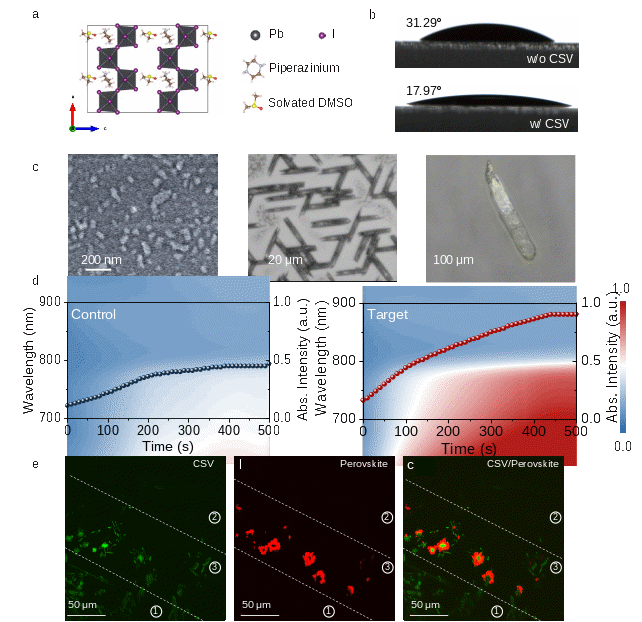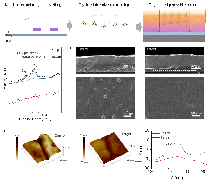 近日,青島能源所太陽(yáng)能光電轉(zhuǎn)化與利用全國(guó)重點(diǎn)實(shí)驗(yàn)室逄淑平研究員與香港科技大學(xué)周圓圓教授團(tuán)隊(duì),提出一種創(chuàng)新的晶體-溶劑化物預(yù)晶種(CSV)誘導(dǎo)生長(zhǎng)策略。該方法將低維鹵化物晶體-溶劑化物(PDPbI4·DMSO)作為“晶種”,預(yù)沉積于SAM修飾基底上,從而實(shí)現(xiàn)對(duì)鈣鈦礦薄膜底部結(jié)晶過(guò)程、微觀形貌及界面電子結(jié)構(gòu)的全面調(diào)控。
