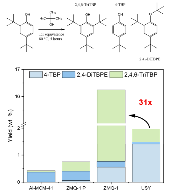 催化性能測試以大體積的2,4-二叔丁基苯酚與叔丁醇的烷基化反應(yīng)為模型,結(jié)果顯示,無磷ZMQ-1對目標產(chǎn)物2,4,6-三叔丁基苯酚的收率達到15.5%,比工業(yè)常用的多級孔USY沸石(0.5%)提高了31倍,也遠超無定形孔壁的Al-MCM-41。這一優(yōu)異性能歸因于ZMQ-1規(guī)整的10/12元環(huán)窗口級晶體介孔結(jié)構(gòu),其能夠穩(wěn)定大體積過渡態(tài)是無定形材料無法實現(xiàn)的。該研究不僅為ZMQ-1的催化應(yīng)用奠定了堅實基礎(chǔ),也為其它基于磷模板劑合成的超大孔沸石的結(jié)構(gòu)優(yōu)化和性能調(diào)控提供了系統(tǒng)性的研究范本。隨著精細化工和生物質(zhì)轉(zhuǎn)化等領(lǐng)域?qū)Υ蠓肿哟呋枨蟮牟粩嘣鲩L,ZMQ-1這類兼具沸石酸性和介孔可及性的新材料有望發(fā)揮越來越重要的作用。