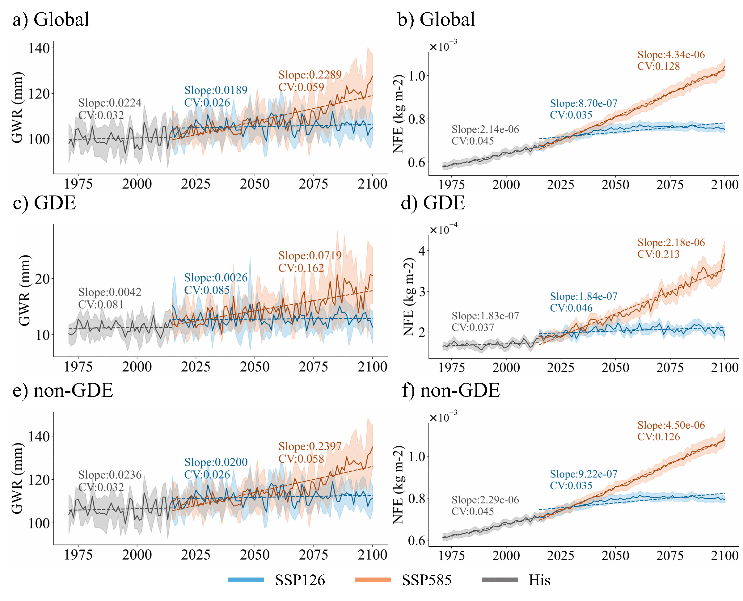 在兩種氣候情景(SSP126和SSP585)下,全球自然生態(tài)系統(tǒng)、GDEs和Non-GDEs在歷史時期(1970-2015年)和未來時期(2015-2100年)地下水補(bǔ)給和固氮效率的年際變化