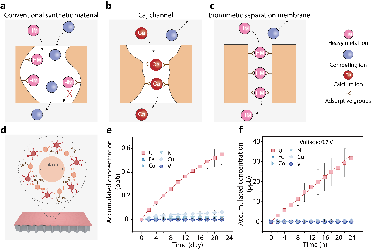 面對上述挑戰(zhàn),青島能源所太陽能光電轉(zhuǎn)化與利用全國重點實驗室高軍研究員團隊聯(lián)合青島能源所/江漢大學李朝旭教授團隊、中國科學院理化技術研究所江雷研究員等人,成功開發(fā)出一種受生物鈣離子通道啟發(fā)的普適性關鍵金屬離子膜分離方法,可高效、綠色、選擇性地提取鈾、銅、金等多種對新能源至關重要的關鍵金屬資源,有望解決傳統(tǒng)關鍵金屬資源提取技術高污染、低效率、高能耗的長期難題。