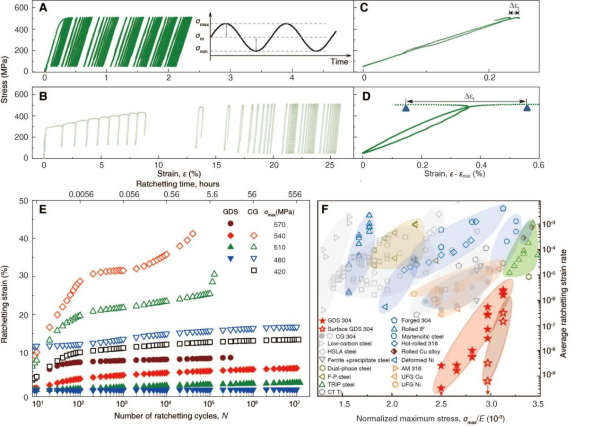 疲勞是金屬材料最主要的失效形式之一,尤其在承受循環(huán)應(yīng)力或交變載荷的工程結(jié)構(gòu)中更為突出。疲勞失效通常在應(yīng)力水平遠(yuǎn)低于材料屈服強(qiáng)度時(shí)發(fā)生,具有突發(fā)性和隱蔽性,對(duì)工程安全構(gòu)成嚴(yán)重威脅。其中,循環(huán)蠕變(棘輪效應(yīng))是一種更嚴(yán)重的疲勞變形現(xiàn)象,表現(xiàn)為非對(duì)稱應(yīng)力循環(huán)與非零平均應(yīng)力導(dǎo)致的循環(huán)塑性應(yīng)變單向累積,最終引發(fā)不可逆轉(zhuǎn)破壞。傳統(tǒng)高強(qiáng)度材料常伴隨循環(huán)軟化和應(yīng)變局域化,二者耦合加劇棘輪效應(yīng),加速構(gòu)件過早疲勞失效。因此,提高高強(qiáng)度金屬材料的抗循環(huán)蠕變損傷能力一直是材料工程領(lǐng)域的一項(xiàng)重大挑戰(zhàn)。