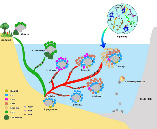 光系統(tǒng)I-捕光天線復(fù)合體在光合作用中負(fù)責(zé)將光能轉(zhuǎn)化為化學(xué)能。由于光合生物對不同光環(huán)境的適應(yīng)性,該復(fù)合體在結(jié)構(gòu)和大小上呈現(xiàn)顯著差異。特別是從海岸帶向“陸”和“洋”兩個方向的環(huán)境適應(yīng)過程中,光系統(tǒng)I-捕光天線復(fù)合體更是經(jīng)歷了深刻的演化。顆石藻起源于古海岸帶,于中生代征服遠(yuǎn)洋并達(dá)到繁盛,對當(dāng)今全球的氣候和生態(tài)意義重大。其中,赫胥黎艾氏藻(Emiliania huxleyi)是顆石藻類群中最著名的模式生物,是海岸帶生物學(xué)中的重要研究對象。因此,赫胥黎艾氏藻光系統(tǒng)I-捕光天線復(fù)合體光能利用分子機(jī)制的研究對于海岸帶生物適應(yīng)性進(jìn)化的研究意義非常重大。