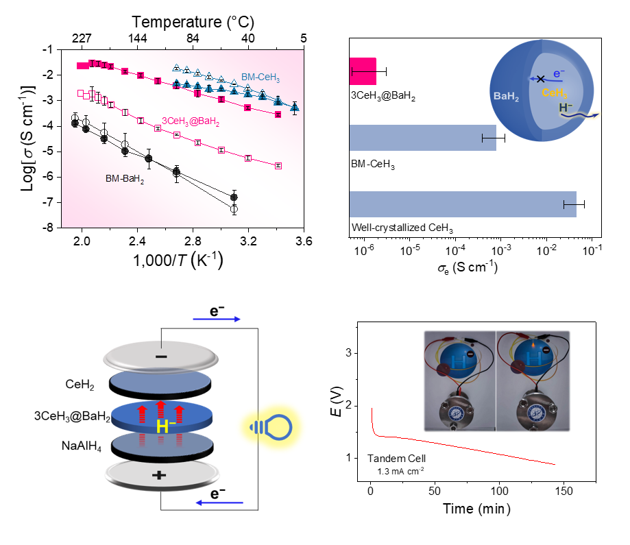 2018年,該團隊啟動氫負離子傳導研究,并于2023年提出了“晶格畸變抑制電子電導”策略,研制出稀土氫化物基低溫超快氫負離子導體(Nature,2023)。在本工作中,為克服上述材料熱穩(wěn)定性不足的問題,團隊以大帶寬高穩(wěn)定性的BaH2薄層包覆穩(wěn)定性較差的CeH3,形成了一種新型核殼結構復合氫化物3CeH3@BaH2,該材料在室溫下即可展現(xiàn)快速的氫負離子傳導特性,并具有優(yōu)異的熱穩(wěn)定性和寬的電化學窗口,是一種理想的電解質材料,為全固態(tài)電池的研發(fā)奠定了基礎。