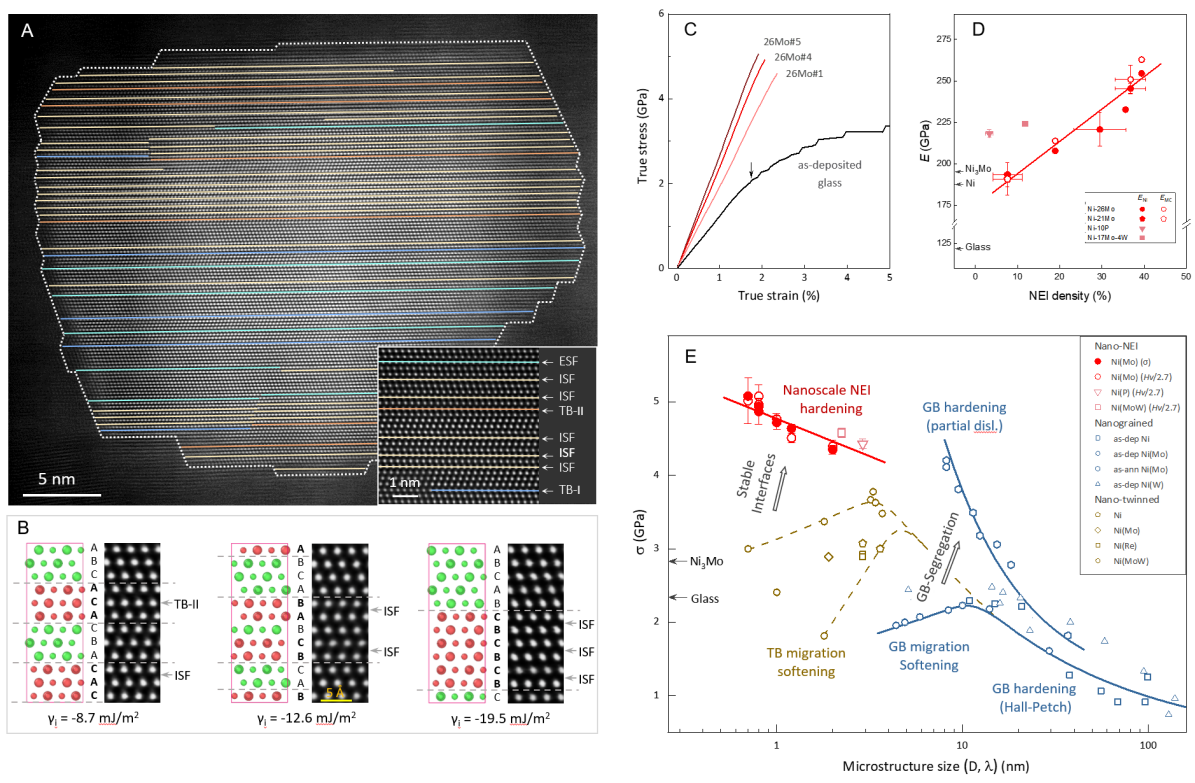 通過在鎳基過飽和固溶體合金中構(gòu)筑極高密度穩(wěn)定的“負(fù)能界面” (A,B), 有效阻礙位錯及界面運動,完全抑制塑性變形,顯著提升楊氏模量(C,D),提升材料強度接近理論極限