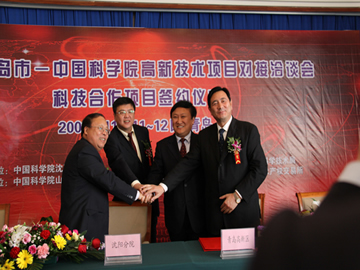 2008年11月11日,青島市-中國科學(xué)院高新技術(shù)項目對接洽談會暨 “中國科學(xué)院山東(青島)綜合技術(shù)轉(zhuǎn)化中心”共建協(xié)議簽字儀式在青島舉行。中科院沈陽分院院長王慶禮,青島市副市長吳經(jīng)建,青島市政協(xié)副主席、青島市高新區(qū)管委會主任劉偉,青島市政府副秘書長劉西山,青島市科技局局長王安民,中科院山東綜合技術(shù)轉(zhuǎn)化中心主任王曉斌,中科院青島生物能源與過程研究所(籌)所長王利生,中科院海洋研究所副所長代亮等出席了會議。