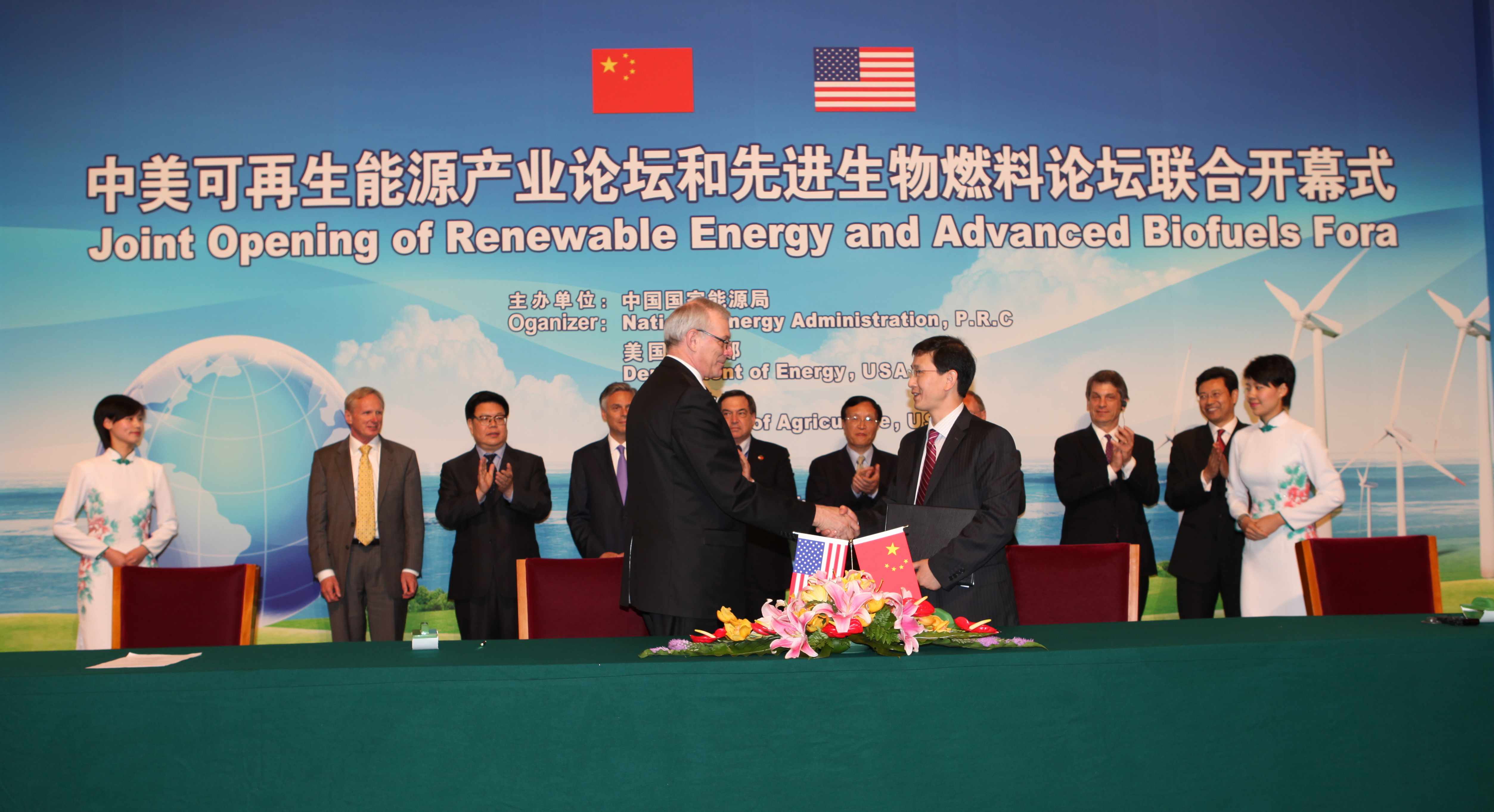 2009年11月17日,中國國家主席胡錦濤與美國總統(tǒng)奧巴馬舉進(jìn)會談并發(fā)布《中美聯(lián)合聲明》。中美雙方簽署了包括可再生能源等在內(nèi)的三項(xiàng)諒解備忘錄文件,計(jì)劃就大規(guī)模利用風(fēng)能、太陽能、先進(jìn)生物燃料和現(xiàn)代電網(wǎng)進(jìn)行合作。