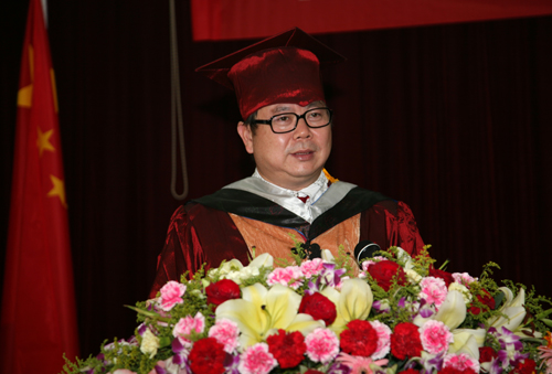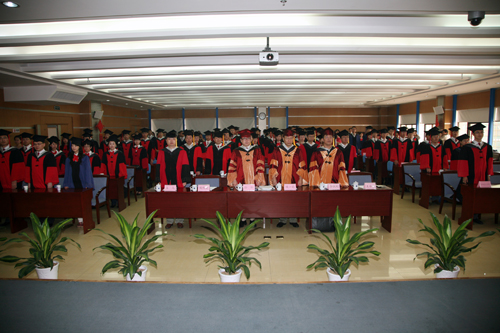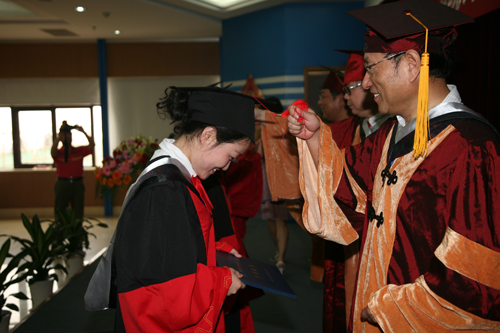畢業(yè)典禮在莊嚴(yán)的國歌聲中開始。副校長侯一筠首先宣讀了2010年度通過畢業(yè)答辯的學(xué)生名單,并向畢業(yè)生表示祝賀。校長孫松、副校長侯一筠、李鐵剛為127位畢業(yè)生扶流蘇并頒發(fā)畢業(yè)證書。