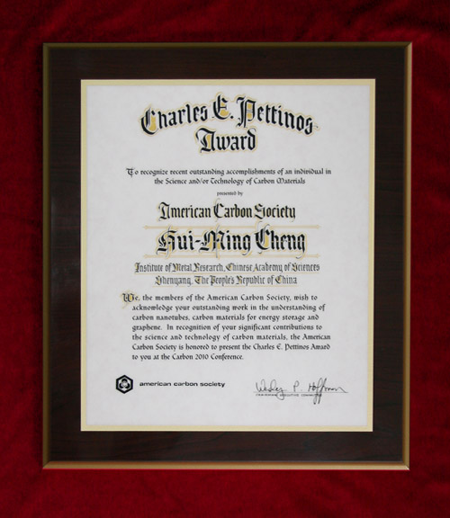 7月15日在美國Clemson大學(xué)召開的2010年度世界碳學(xué)術(shù)會議(Carbon 2010)上,金屬所成會明研究員榮獲2010年度Charles E. Pettinos Award。此獎項由美國碳素學(xué)會于1969年設(shè)立,評選并授予近期在碳科學(xué)與技術(shù)領(lǐng)域做出杰出成就的個人,2000年以前每兩年、2000年以后每三年評選一次,每次僅選出一人。成會明研究員以其在理解碳納米管、儲能用炭材料及石墨烯方面的杰出研究工作而榮獲此獎。此獎也是第一次授予中國科學(xué)家。在Carbon 2010學(xué)術(shù)會議上,成會明研究員還以“能量儲存用碳基材料的研究進展”為題作了獲獎紀(jì)念特邀報告,受到眾多與會學(xué)者的好評。